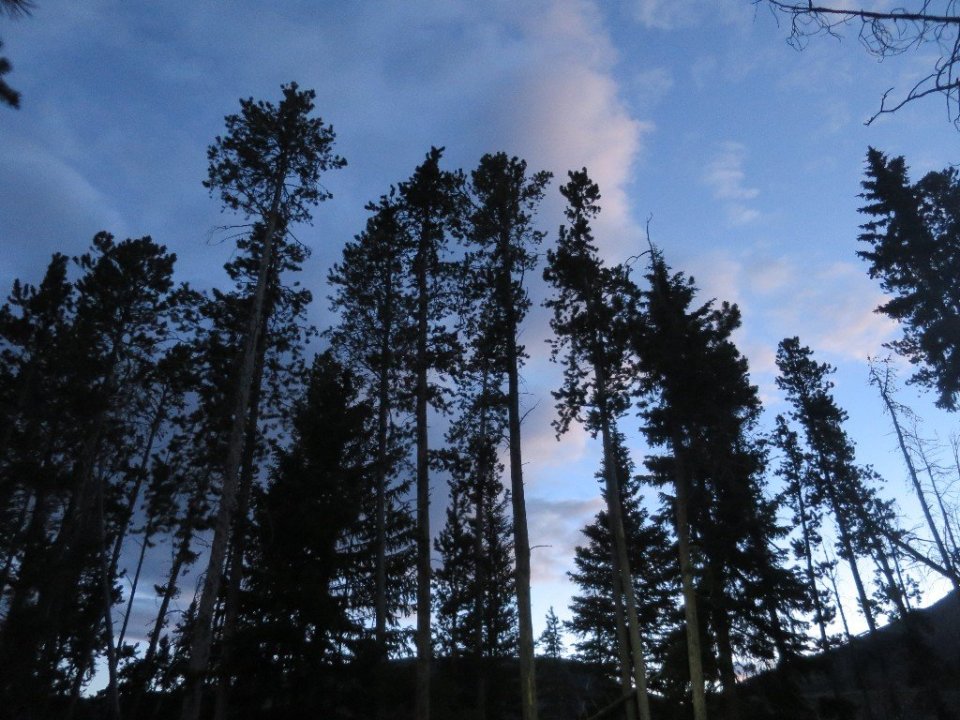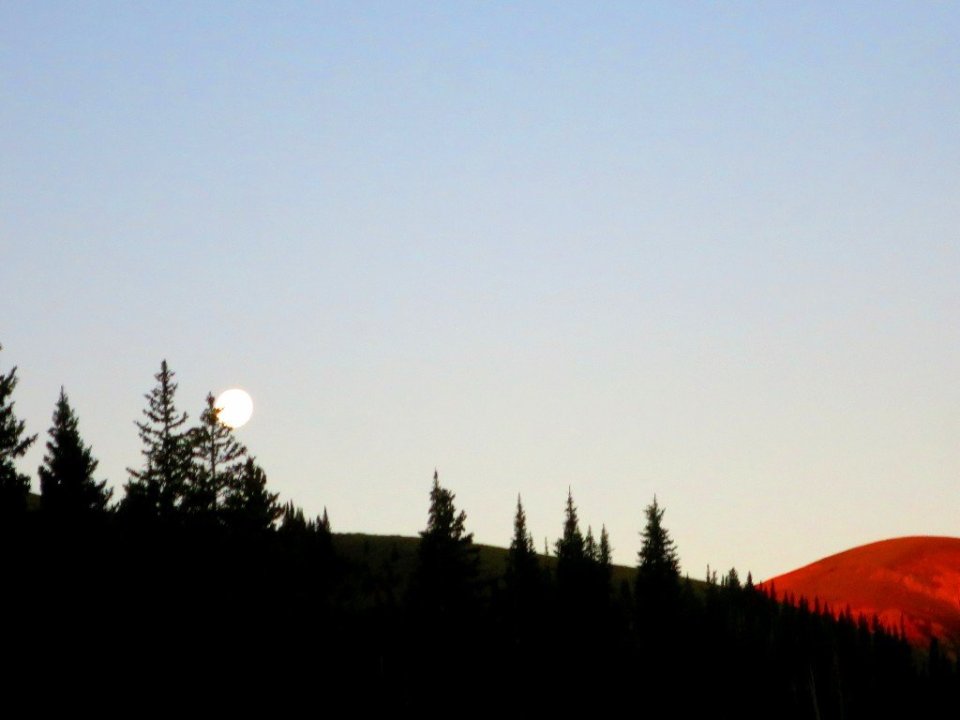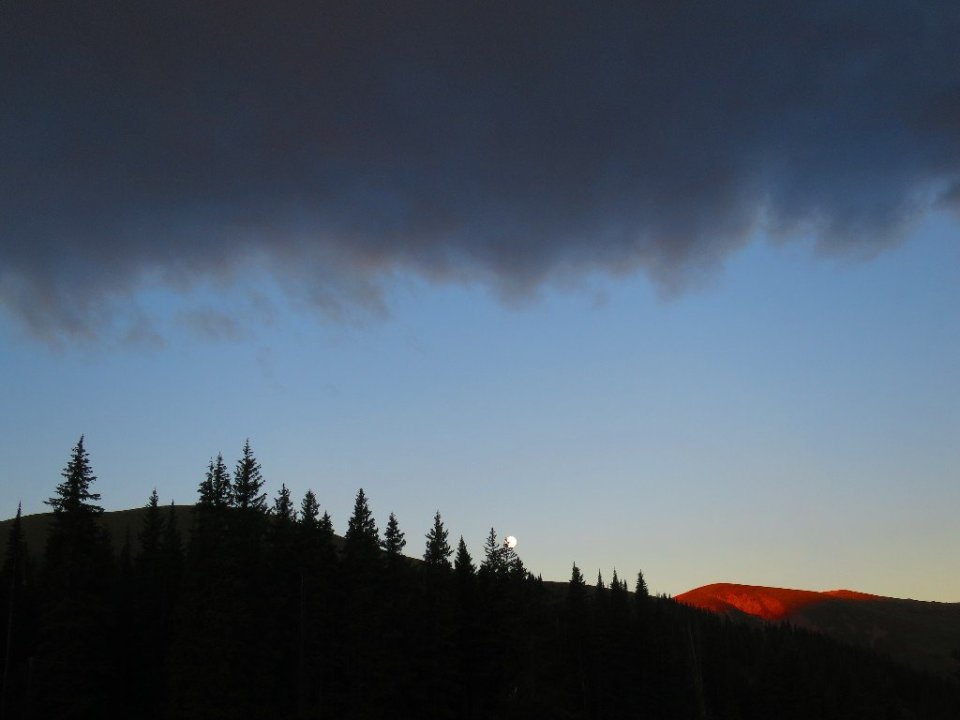 We camped at the edge of the woods with a creek nearby, at the foot of Garfield Mountain. Surrounded by big hills this provided a perfect environment for birds. This morning as we broke camp, and the suns first rays were peaking over the horizon, an orchestra of birds sang for us. Their beautiful music faded away as we hiked out of the creek valley and up towards a mountain that looked like it had a nipple on top. The sky was mostly clear with one big dark cloud. An almost full moon high up in the sky was lit like a lantern guiding us out of the valley.