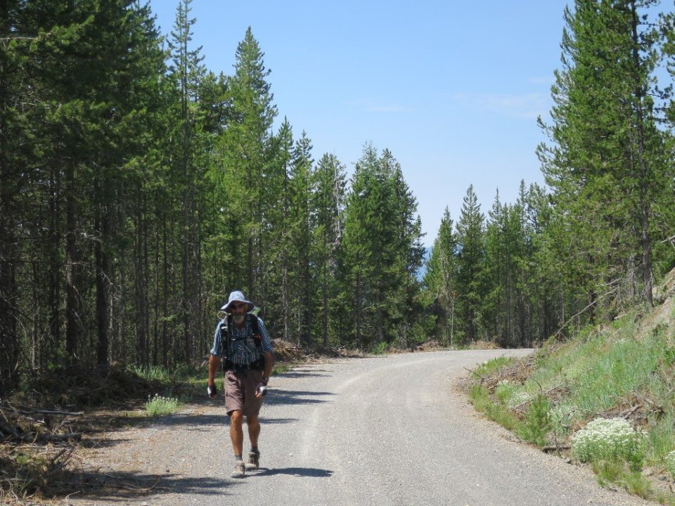 It was a cool start to what promised to be a warm day. Patches of grey cloud indicated that it may rain, although rain was not predicted. We walked the 2 miles along Highway 20 to our turnoff at Mack’s Inn. It was a surprise to see Paya just before the turnoff, he was trying to hitch a ride to West Yellowstone to pick up his bounce box. We stopped for a chat and said goodbye hoping to see him again down the track.