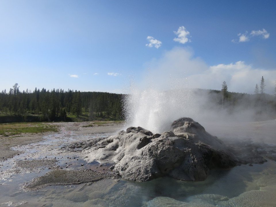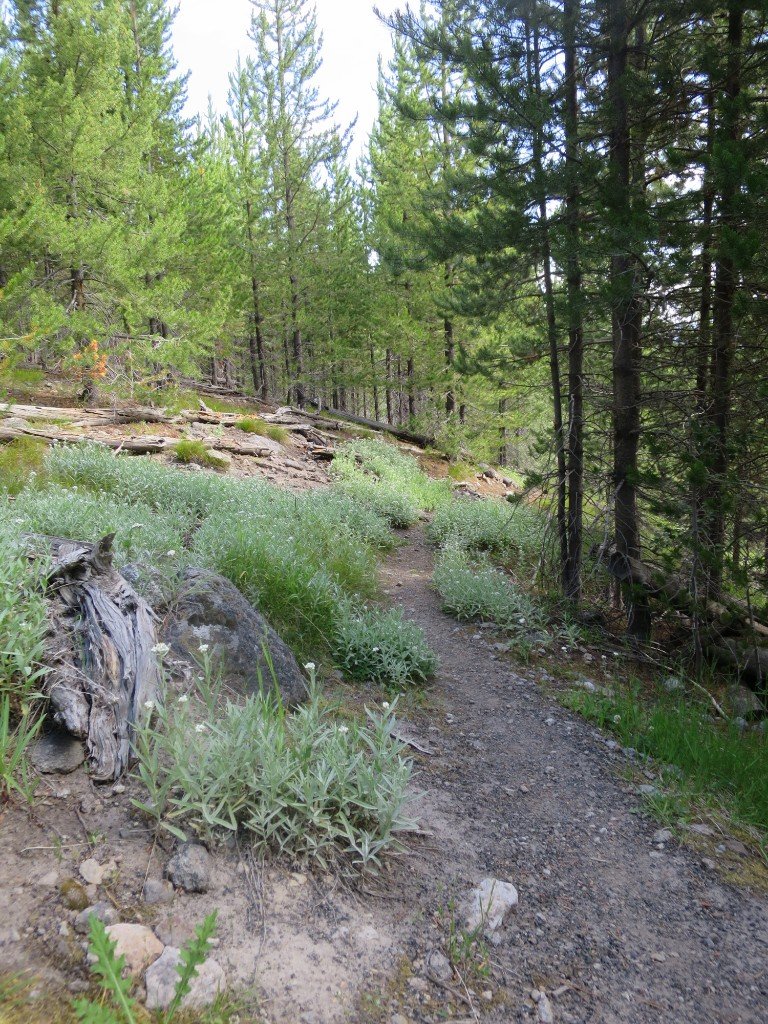It was tempting to hang around with the other park visitors and enjoy this wonderland but we had many more miles before we made camp. So we left before Old Faithful geyser erupted. Back on trail we took a detour to another geyser, The Lone Star, hoping to see it erupt. But no luck here, although we did see a smaller one erupt almost right on trail later in the afternoon.