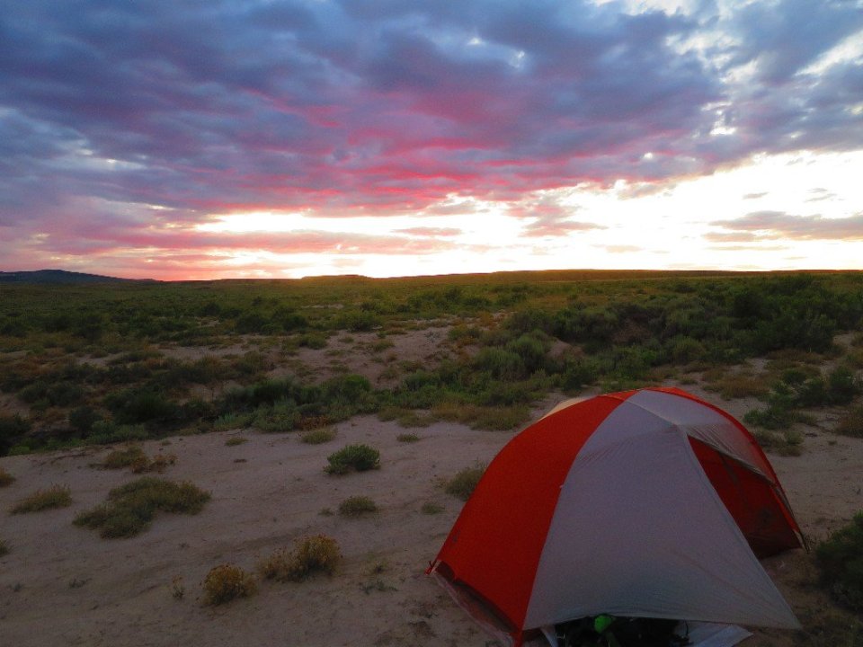 As the sun began to dip on the horizon the traffic disappeared from the road. We crossed a fence and camped in the field. Not much vegetation around to provide any protection from the wind. We watched a brilliant red sunset while being serenaded by coyotes.