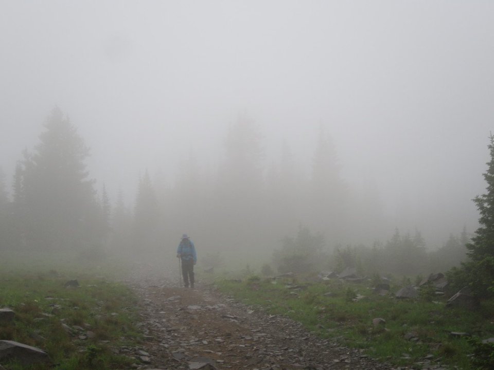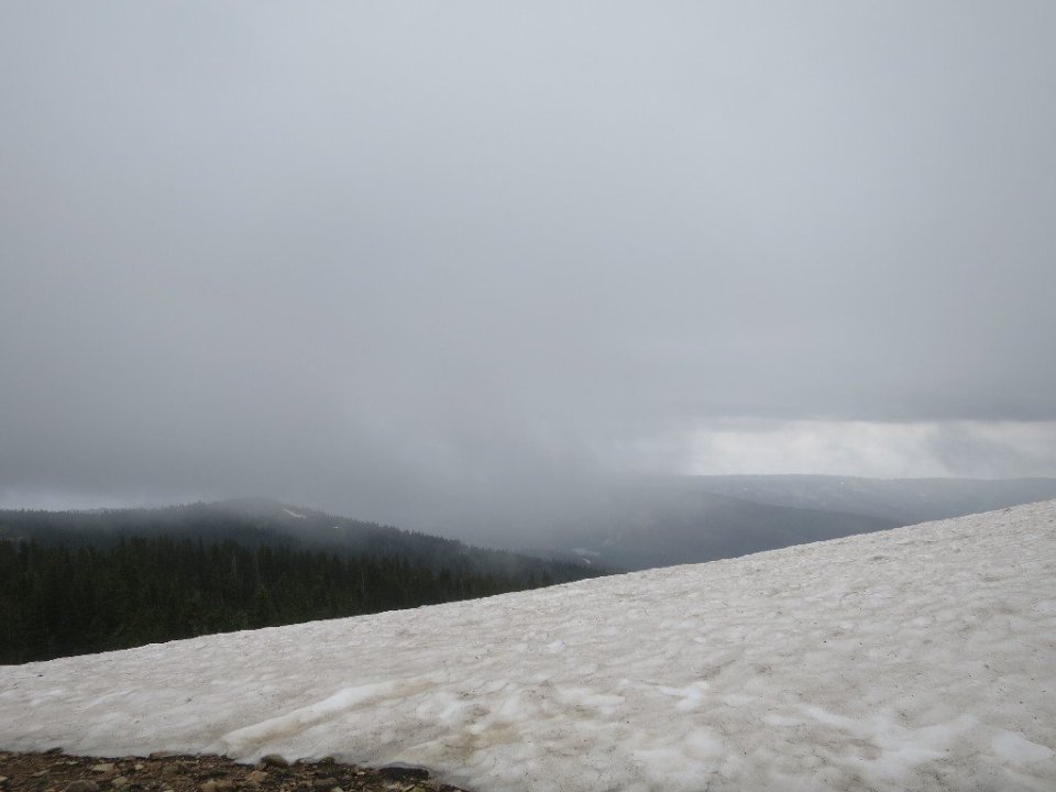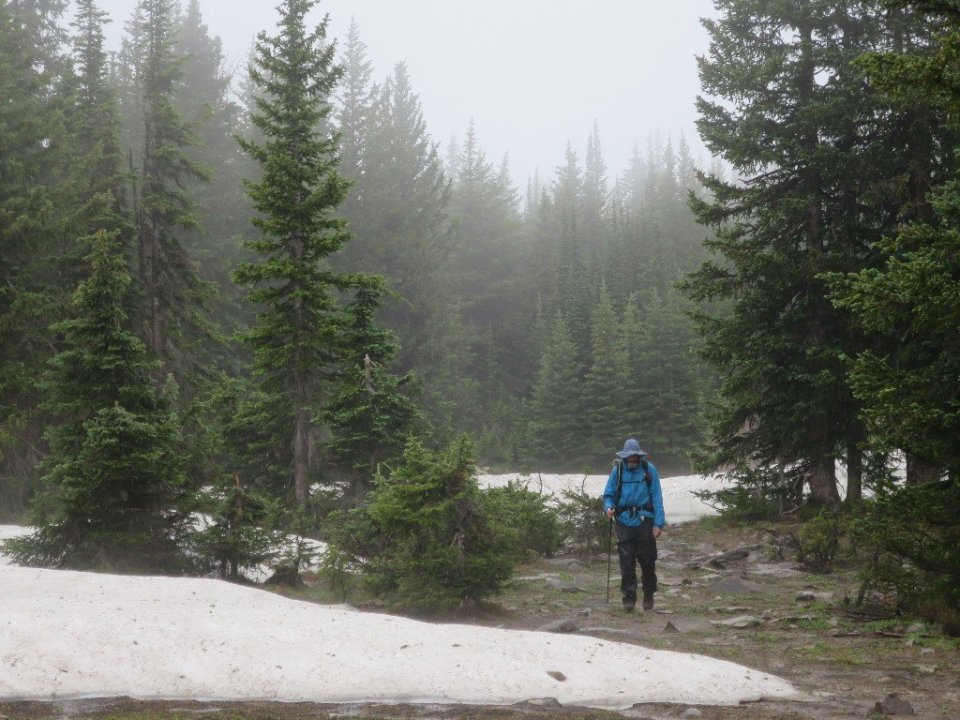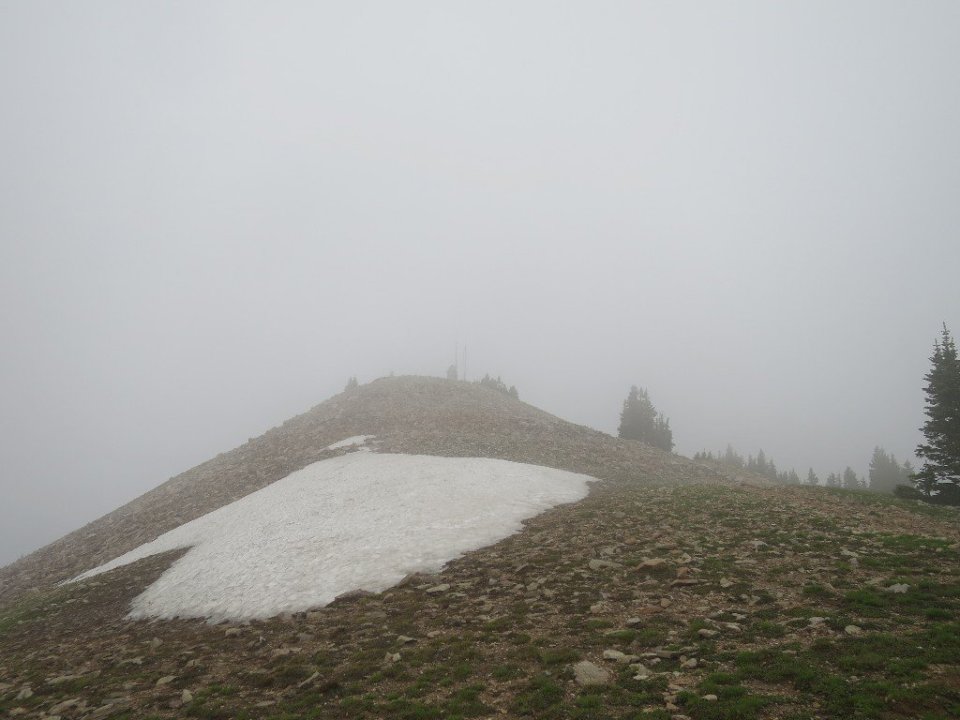 The cool, clean mountain air was delicious. A light drizzle of rain continued to fall as we climbed Mt Bridger at 11,000 feet. The drizzle soon turned into rain proper. At least it wasn’t overly cold. By the time we reached the top of the mountain, a mist had rolled through closing out any views. I had hoped for phone service from the top but had no luck. The rolling mist made the air feel colder. This feeling was exacerbated by snow patches still lingering near the top.