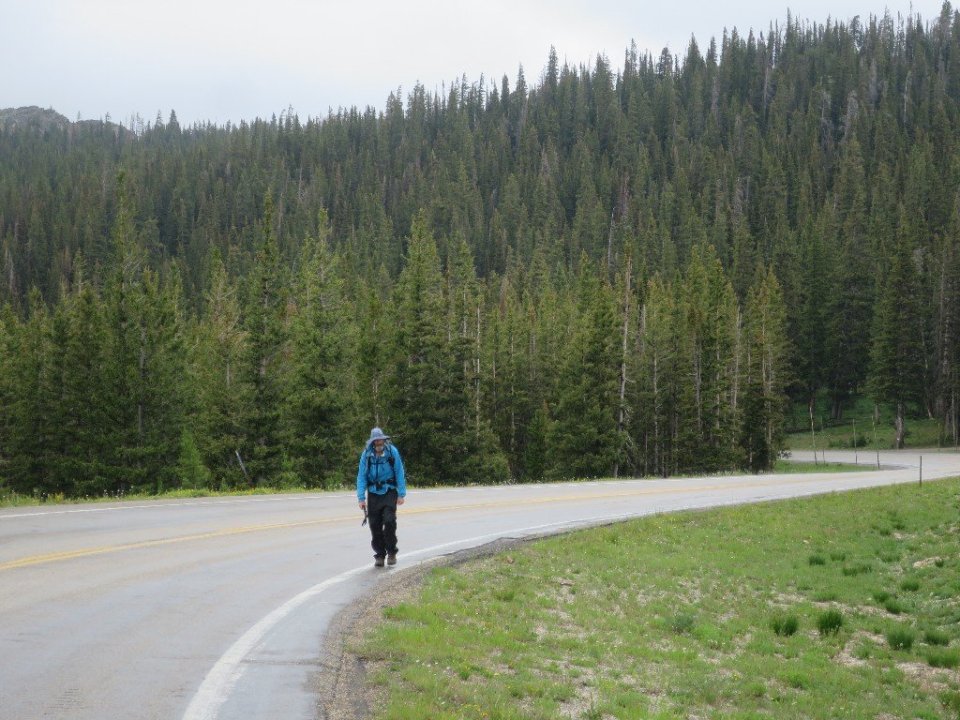 On the way down the mountain I got phone service. We had heard that getting a ride from the trail junction to Encampment was difficult. I had a phone number for a trail angel in town and I was able to contact Tamy who was able to drive out to come and get us. That was such a relief. My feet were pickled in the shoes and I was looking forward to a shower and dry feet. Hammer had new shoes and managed to keep his feet mostly dry.