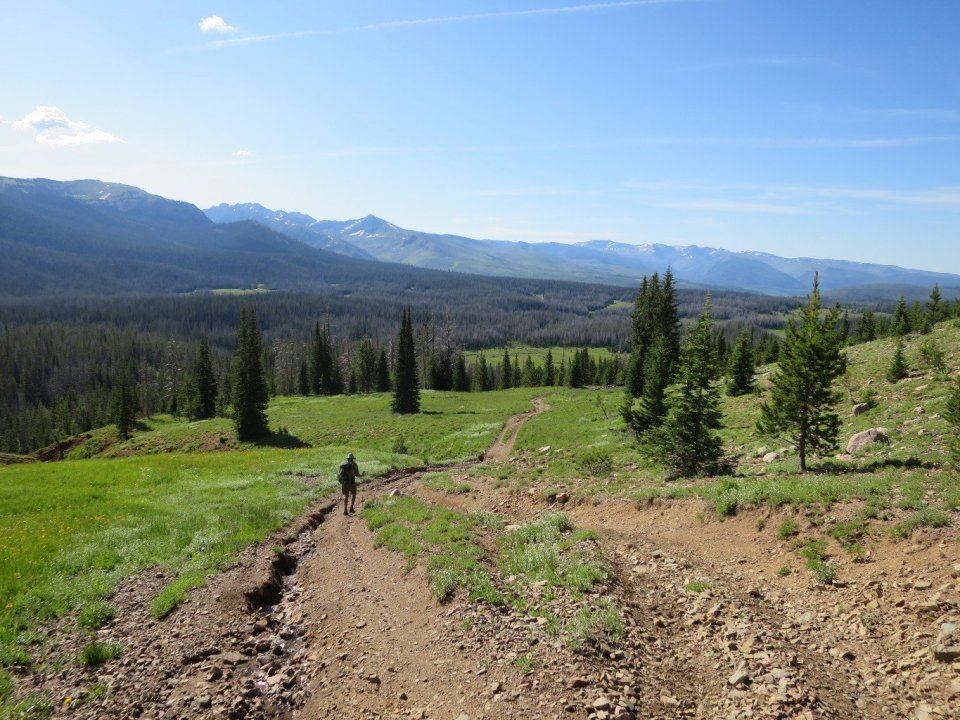 From our campsite, the trail continued on the jeep track that was a bit of a roller coaster, very steep and eroded in sections. We made slow progress. The views from the rises were expansive towards rugged mountain peaks in the distance. It was so still and silent, no chirping or birdsong, just the sound of bees buzzing around and a few mosquitos.