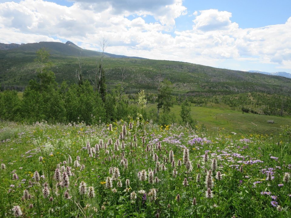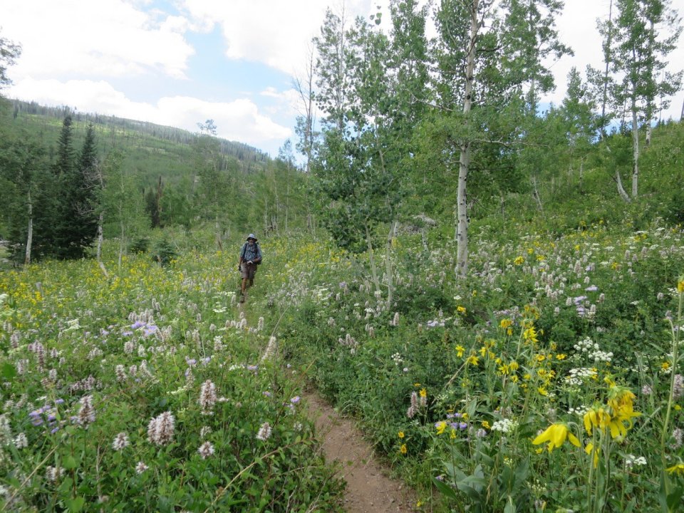 By mid-morning we descended to a meadow with a creek running through it. Everything looked so lush and green. We followed a series of these meadows stopping at Trail Creek for lunch. The descent to the creek was incredible. The slopes were covered in an impossibly dense array of colour and variety of wildflowers.