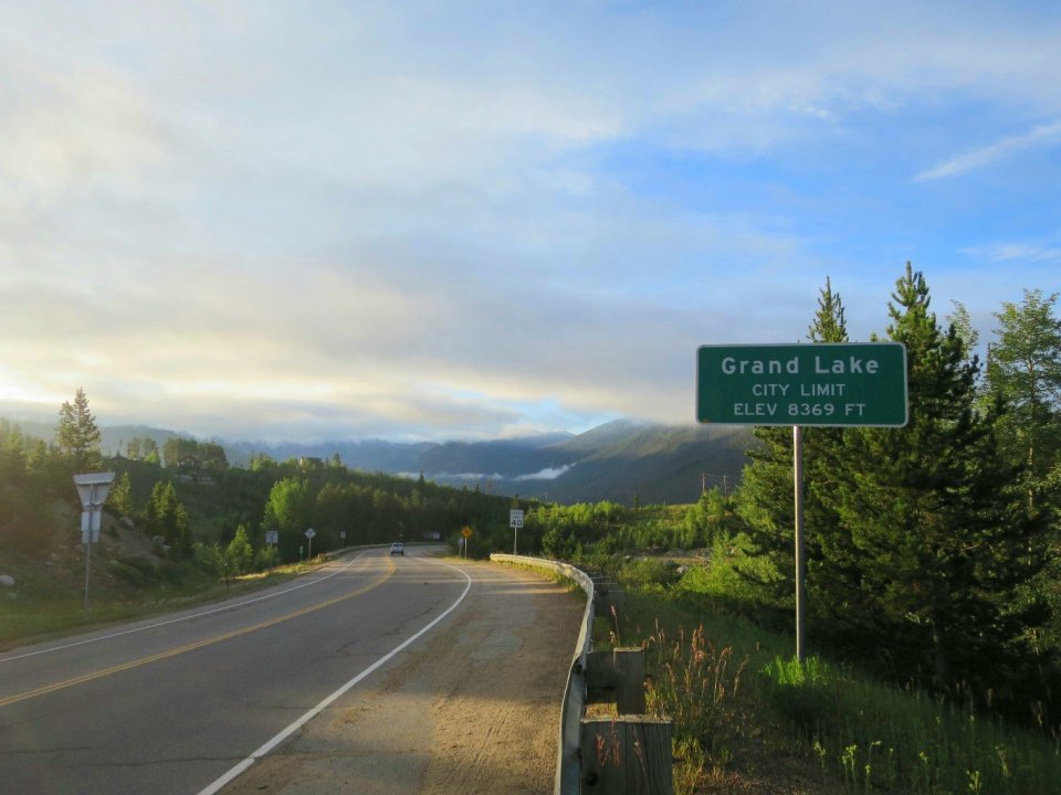 I had trouble sleeping being camped so close to town. We were about two miles out from Grand Lake Village. It was light by the time we broke camp and got back out on the highway to walk into town. On approaching the town we saw a moose, a very large female grazing peacefully in the meadow. The mountain tops fringing the lake shore were capped by low hanging fog. It looked quite magical.