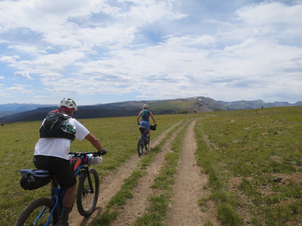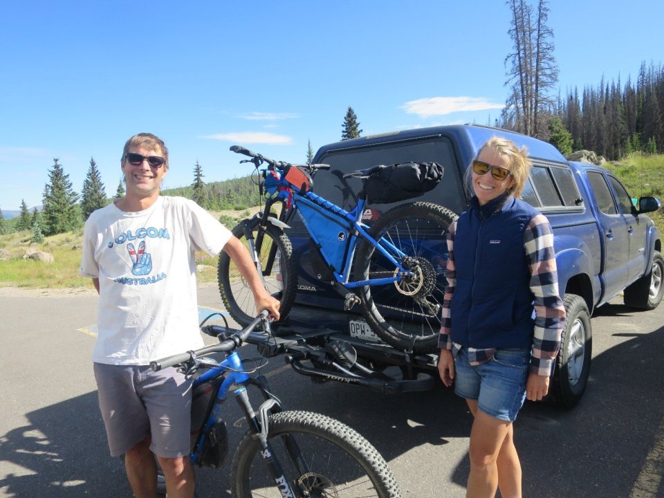 We stood by the side of the road with our sign. Most drivers were friendly and waved or indicated they were going a short distance. So that was encouraging. And within 15 minutes a car with a bike rack with mountain bikes stopped to give us a ride. So generous as they had to rearrange the backseat to fit us in. Betsy and Andy were our trail angels. They live in Boulder and were heading out to the Spring Creek Pass to cycle the Colorado Trail to Durango over this coming Labour Day long weekend. Betsy is a freelance journalist who writes about cycling and other outdoor pursuits. Both are keen adventurers who spend a lot of time outdoors. Andy had travelled to Australia before and by some strange coincidence was wearing a shirt with a Australian connection. We got such a laugh when we got out of the car. Hammer checked out their bikes and marvelled at the compact setup. It’s always a pleasure to meet new and interesting people. We said goodby, knowing they would pass us along the trail before too long.