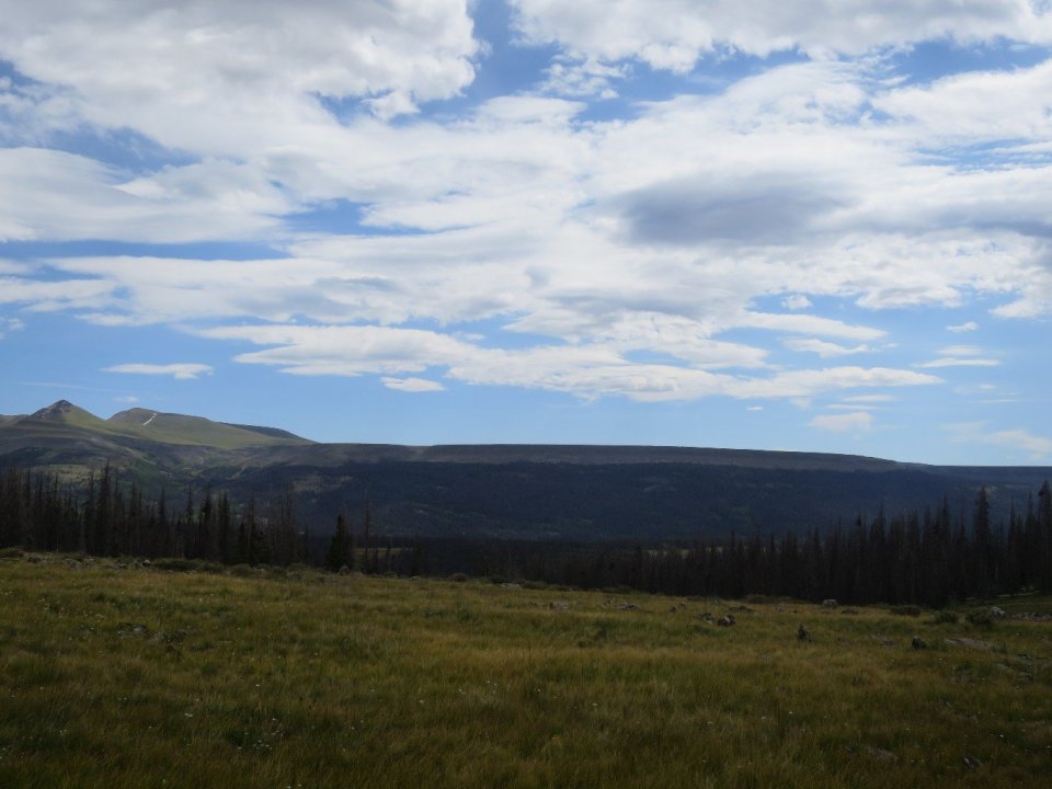 The hum of grasshoppers accompanied us as we headed back out for our penultimate leg, 117 miles from Lake City to Pagosa Springs. From Spring Creek Pass we ascended 2,300 feet over 16 miles to the highest point on the Colorado Trail. Our packs were heavy being loaded with 6 days of food. So the first couple of hours felt hard and laboured. We soon got back into a hiking rhythm and slowly made our way up. Looking back towards the Pass as we slowly ascended, the Snow Mesa where we camped yesterday came into full view. The mountain ranges in front of us stretched as far as we could see. Such incredible geology.
