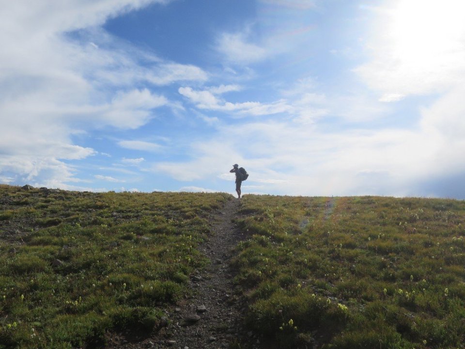 Stopping for lunch is always the highlight of the day. I was hoping that todays mushroom risotto will give me a bit of a boost for the big climb this afternoon. It was a warm day and by the time we finished lunch and were back on trail clouds had started gathering. We met a northbound flip-flop hiker Bearbait whom we had met earlier in Montana. Always nice to see people out here. He will finish in Rawlins and was a bit over the trail and couldn’t wait to finish. We were happy to be able to give him our roll of toilet paper, which he forgot to buy in Pagosa Springs.