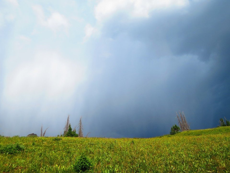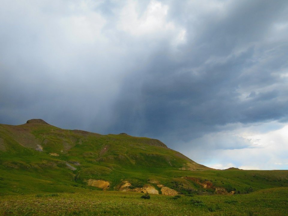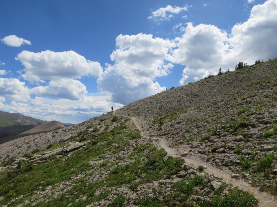 Soon after we started the slow climb towards the High Point on trail. Ominous looking dark clouds were ahead. It was a 2 mile long, 1,600ft climb to a High Point at 12,800ft in elevation. Hammer was gung-ho to keep going despite the building rumble above the mountain we were approaching. Sure enough half way up the mountain, the temperature dropped suddenly and drops of rain fell.