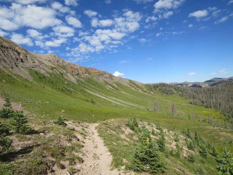 From the breakfast ridge we continued rolling up and down the ridgeline for over 10 miles before we stoped for lunch. It was a lovely warm clear sky day, hardly a breath of wind. Perfect conditions to be high up above the treeline. It wasn’t all ridgetop, for sections where the ridge was inaccessible the trail followed around at lower elevations.