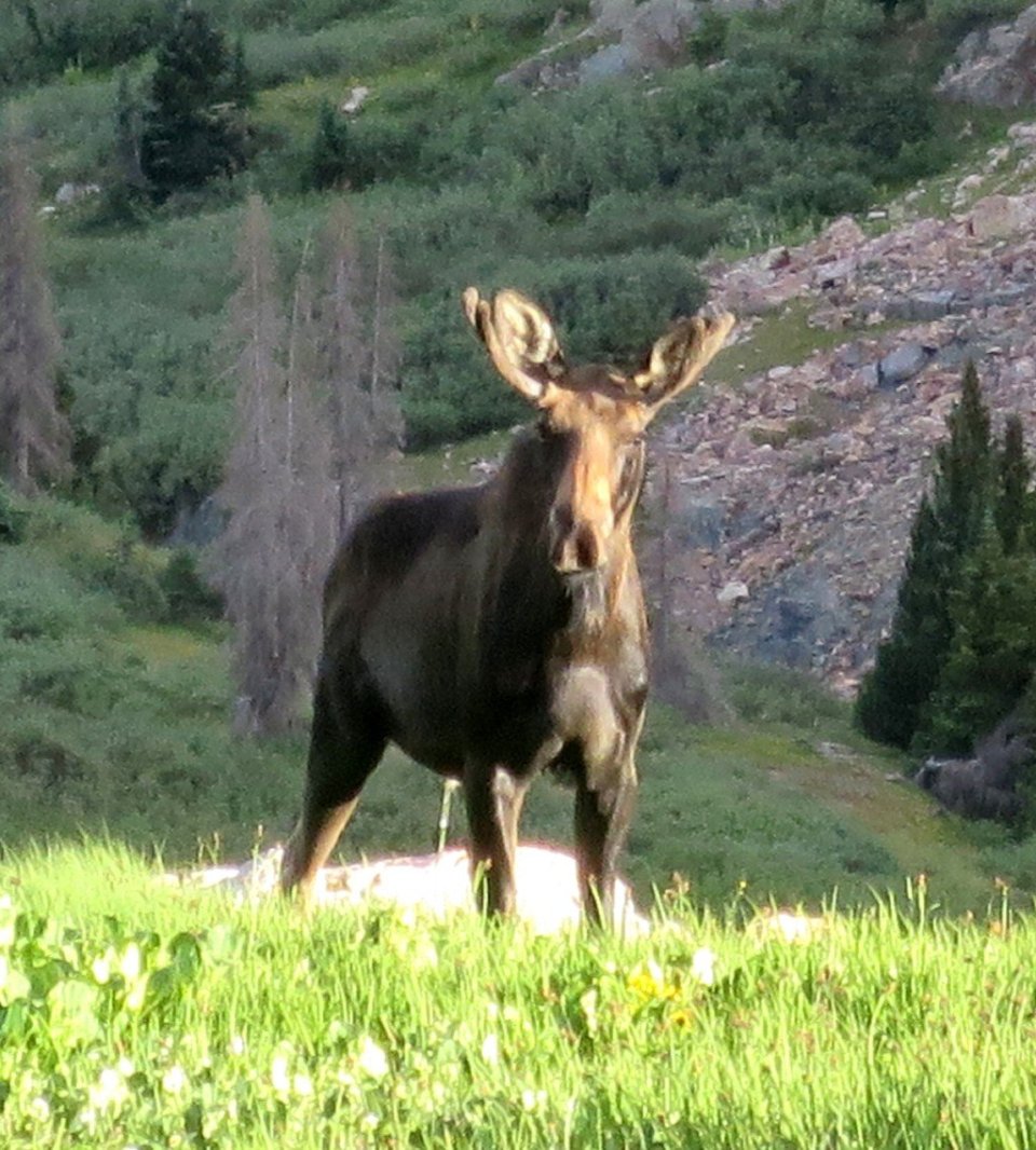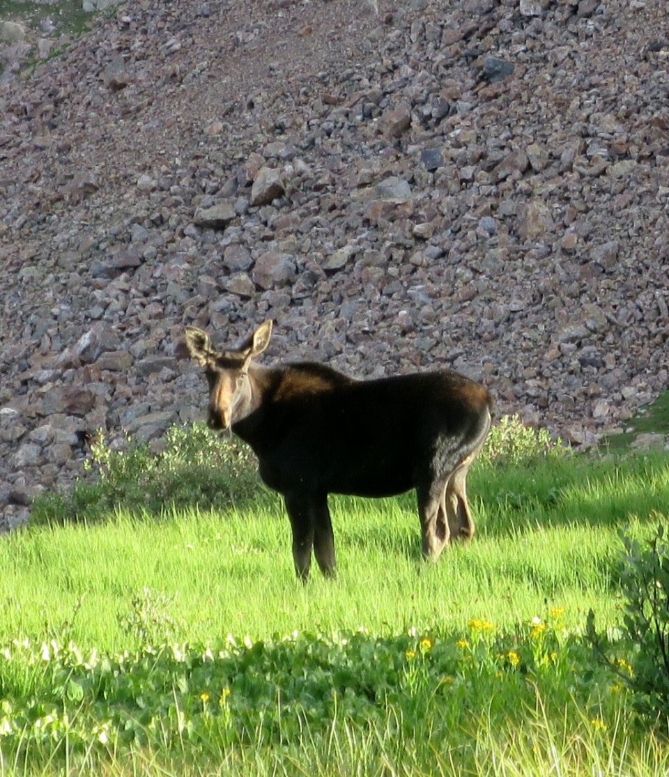 The trails separated soon after we left the meadow. We descended down a narrow gully lined with incredibly dense bright and beautiful wildflowers still blooming in great profusion. We passed two young moose grazing not far off trail. They watched us with an intense gaze as we walked by. Realising that we were not going to make our days destination we stopped at the first suitable campspot and called it a day before the light disappeared.