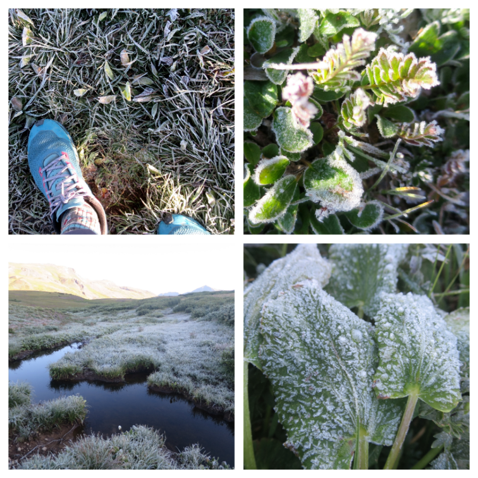 We soon met Denali, a feisty small woman who is hiking the CT southbound. We chatted to her for a bit. The ground was covered in a thick layer of frost and my feet were getting cold. I don’t think these Salewa shoes have the insulation in the soles that the Salomons did. We said goodby and continued on, losing the sunlight behind a mountain. It was very cold now, the ground was very boggy and it was hard to keep dry feet. We descended through this cold, wet boggy ground for about half an hour before I realised that we should not have descended so far. We were on the wrong trail. So we backtracked and got more wet feet on our return.