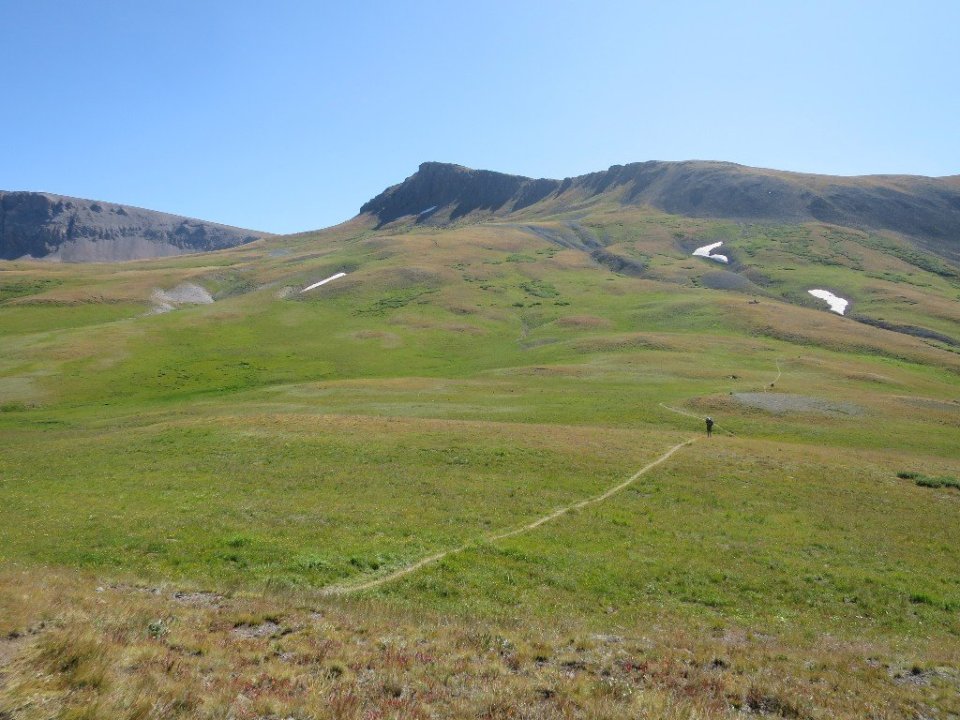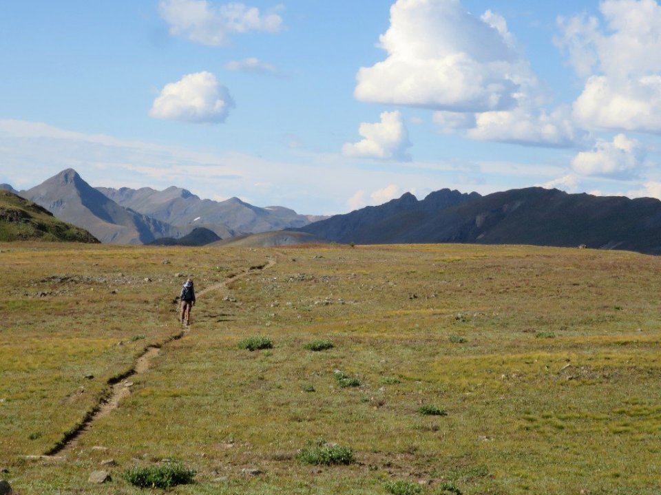 Just before the trails separated we hiked for a few miles along a huge open meadow. Ominous dark looking mountain peaks were to our right, maybe the Needle Mountains.