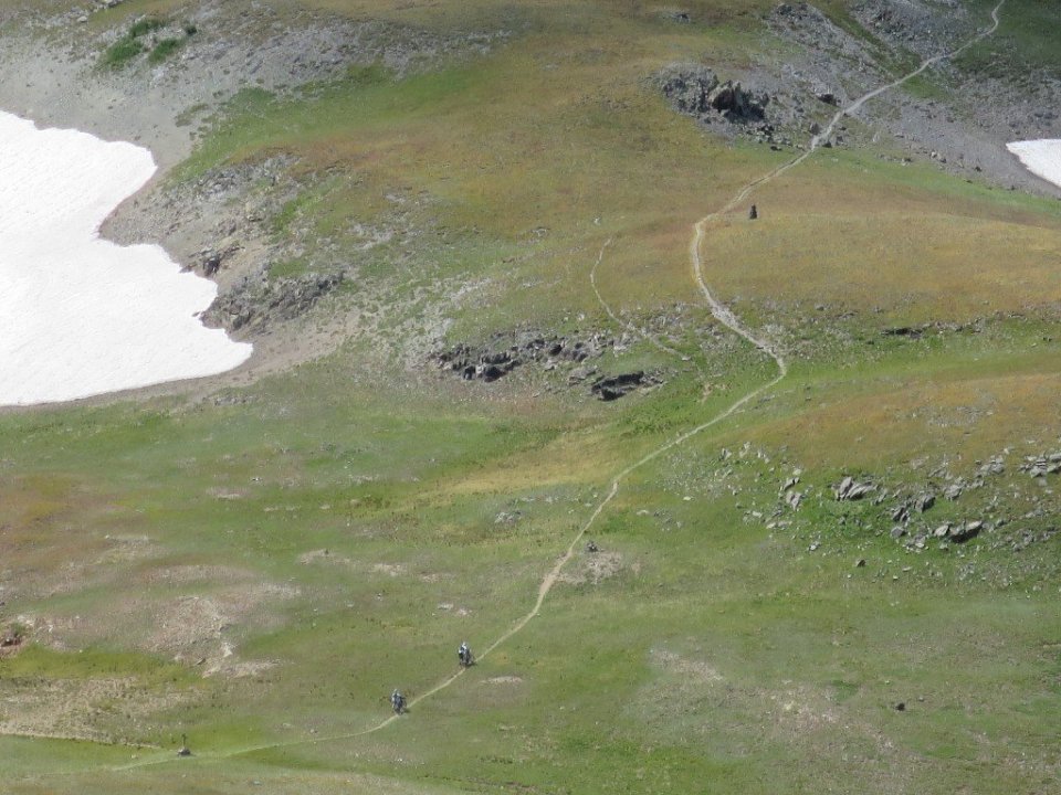 This morning was one of those few occasions that neither of us wanted to wake early. It wasn’t overly cold maybe just accumulated fatigue. But knowing that we wanted to be in Pagosa Springs by Tuesday was enough to rouse us to wakefulness. Thunderstorms are predicted for Tuesday and Wednesday next week and we wanted to be off the high peaks by then. The star studded night sky promised a clear sky day. We broke camp and headed up the to the first of todays 7 passes or high points. The passes were between 12,600ft and 13,000ft and we aimed to get over Hunchback Pass before the end of the day.