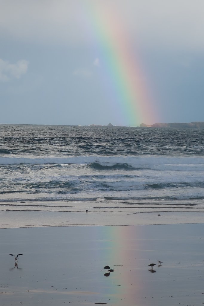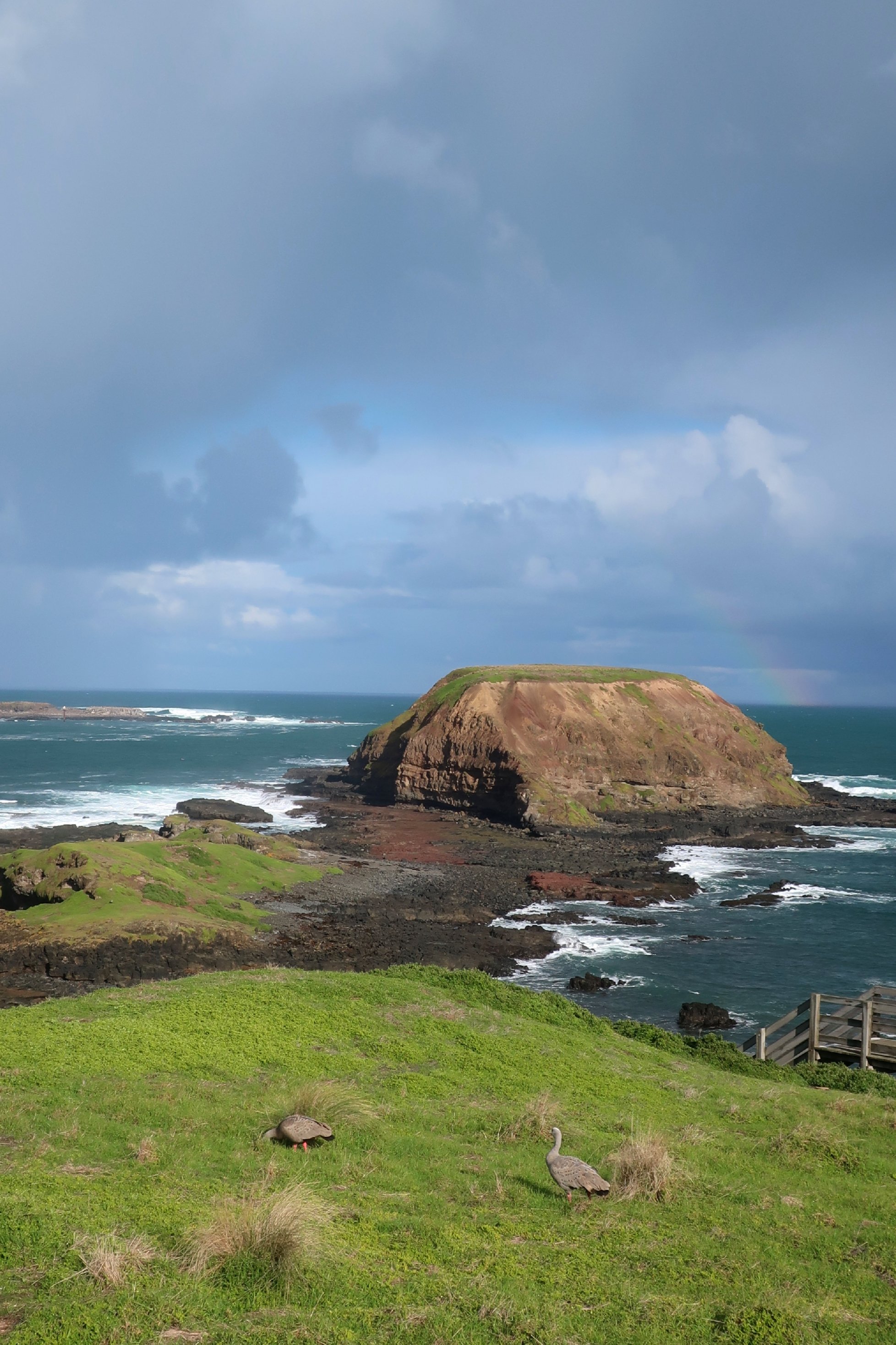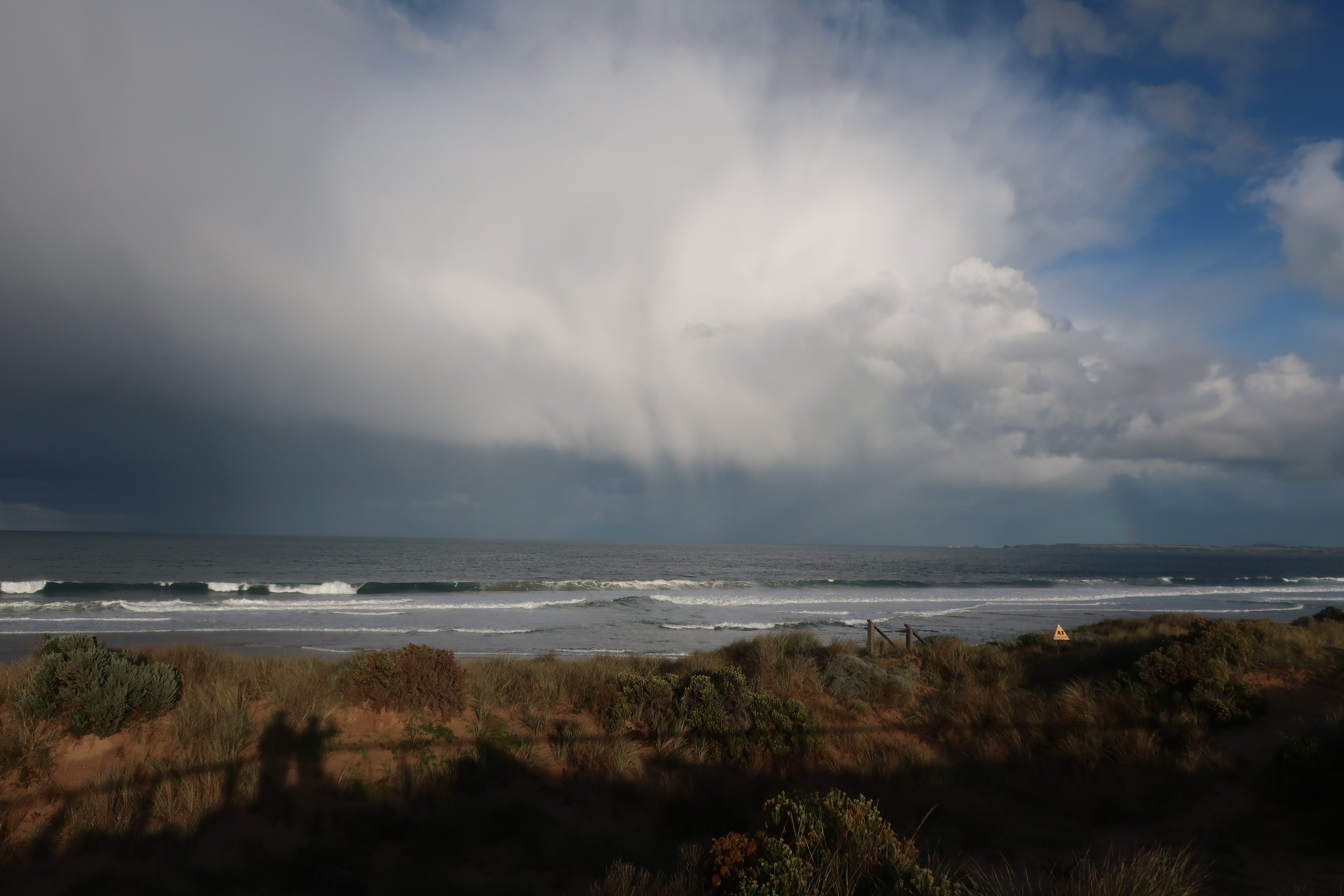A bridge joins the island to the mainland. We travelled anti-clockwise, with the first stop ar Cape Woolami. The sea was up and there were some strong riptides in actions. The sun shining behind us illuminated the beautiful green, greys of the dune vegetation. Soon a rainbow started to appear amongst the dark clouds over the ocean. Windswept, deserted and quite beautiful.