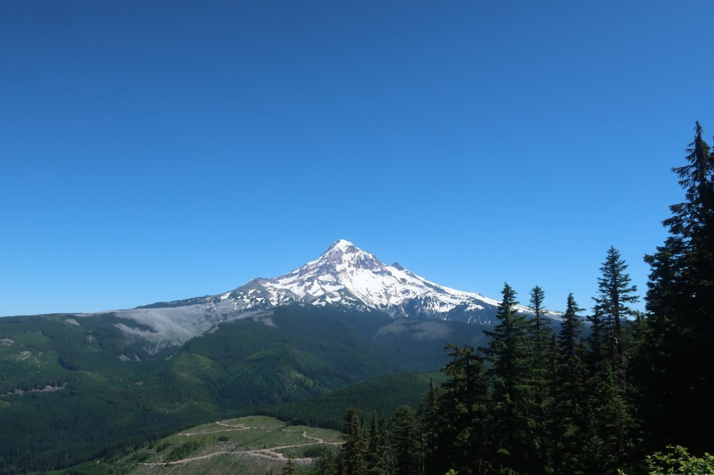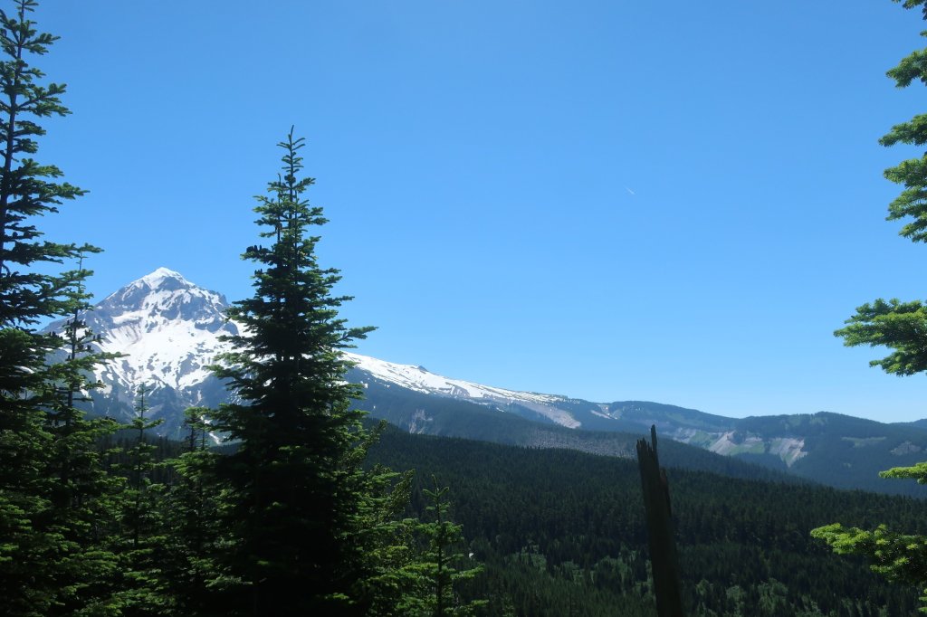 It was a long and sweaty ascent to Lolo Pass from Muddy Creek, with neverending switchbacks. The sun was shining and whenever we emerged from the green tunnel there was Mt Hood, framed by a clear blue sky, looking remarkably close by at times and distant at other times. Mt Adams could also be seen way off to the north. We will be heading towards it over the next few days.
