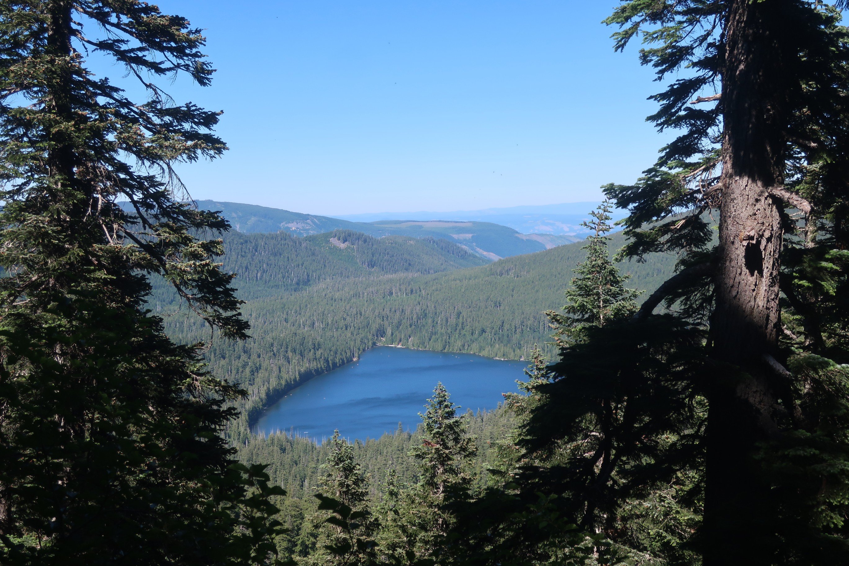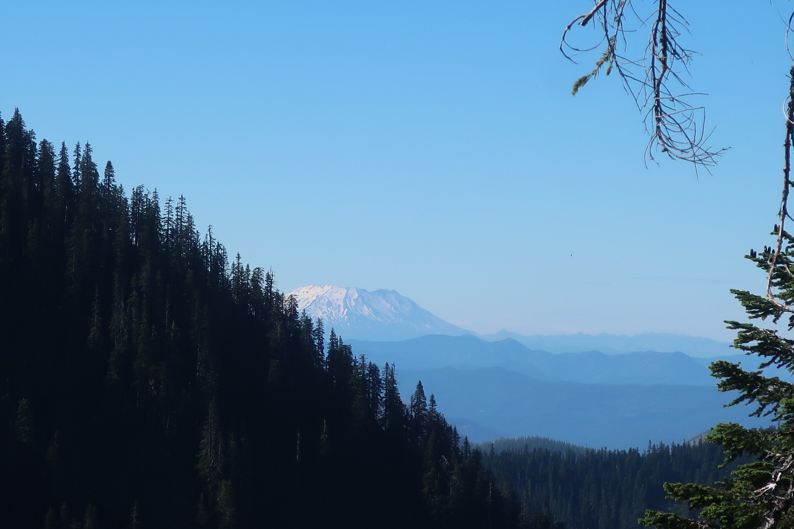 The blowdowns were remarkable because they were huge, healthy looking trees that seems to have fallen recently. The worst of the really big trees had been tidied up so the trail was passable but there were so many others that we had to shimmy over or under. By late afternoon we were on trail that wou d it’s way aking very steep slopes. It was getting late in the day and we were keen to find a campsite. We passed a few that were almost on the trail. We kept going, hoping not to run out of daylight, and found a lovely campsite with filtered views of Mt Hood in the distance. Such a relief to stop for the day.