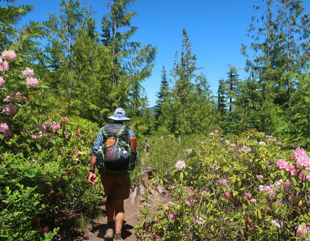 Hiking felt so much easier, once we were off the snow. As soon as we started to descend the most magnificent rhododendron shrubs started to appear. Colourful fragile blooms lined the trail. They got more prolific as we hiked on. It was a rhododendron garden in the shade. A day hiker we passed later in the morning mentioned that rhododendrons don’t really belong here. They were introduced and have spread. So much prettier then Lantana, our problem introduced plant.