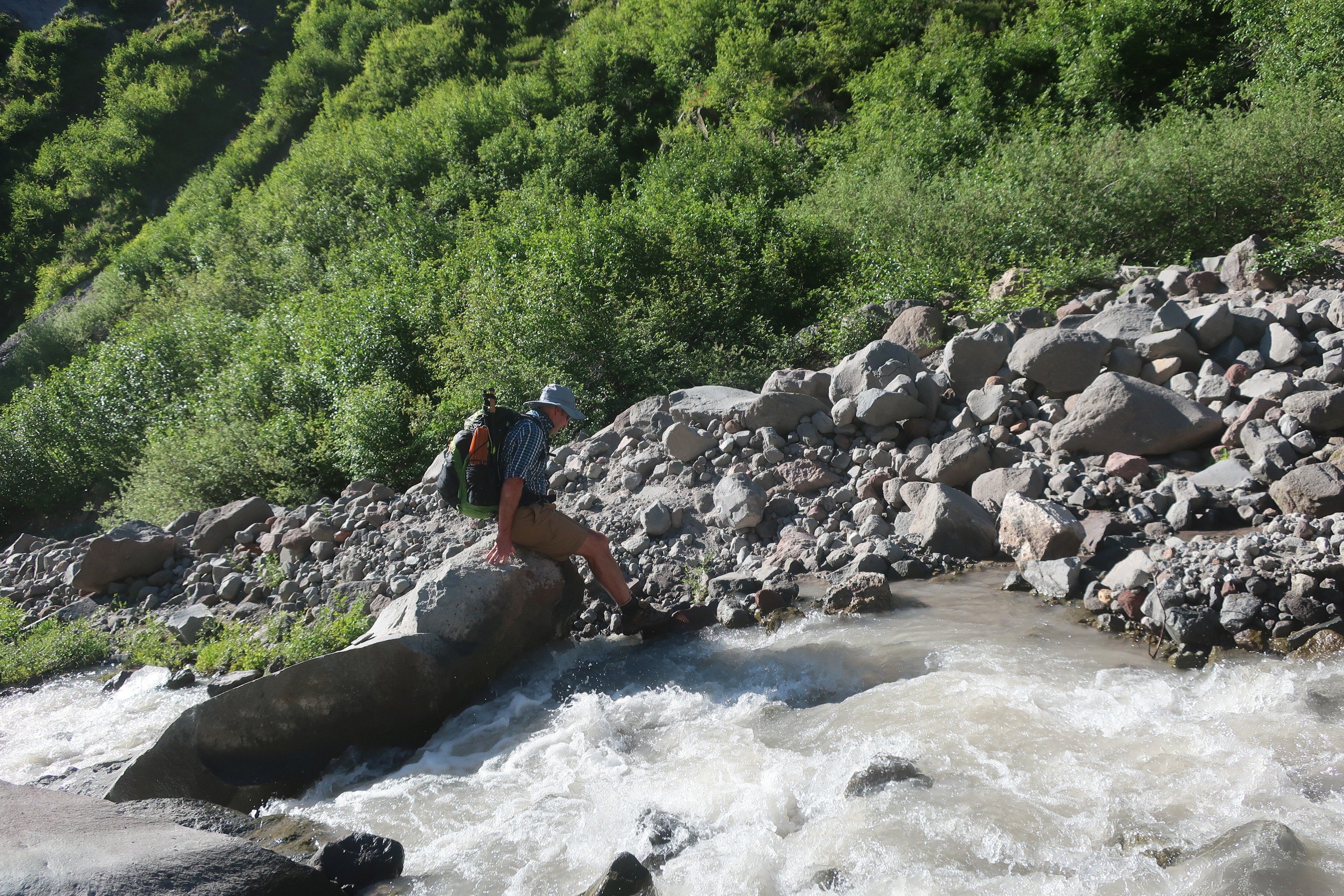 It didn’t take long before we hit snow and then more snow. Our progress was slowed even further. Lucky that days are so long, with sunset around 8.45 tonight. We had a few creek crossings with one a bit tricky. It wasn’t particularly wide but it was flowing fast, swollen by snowmelt in the late afternoon. It took us a while to find a good spot to cross without getting wet feet or breaking a leg.