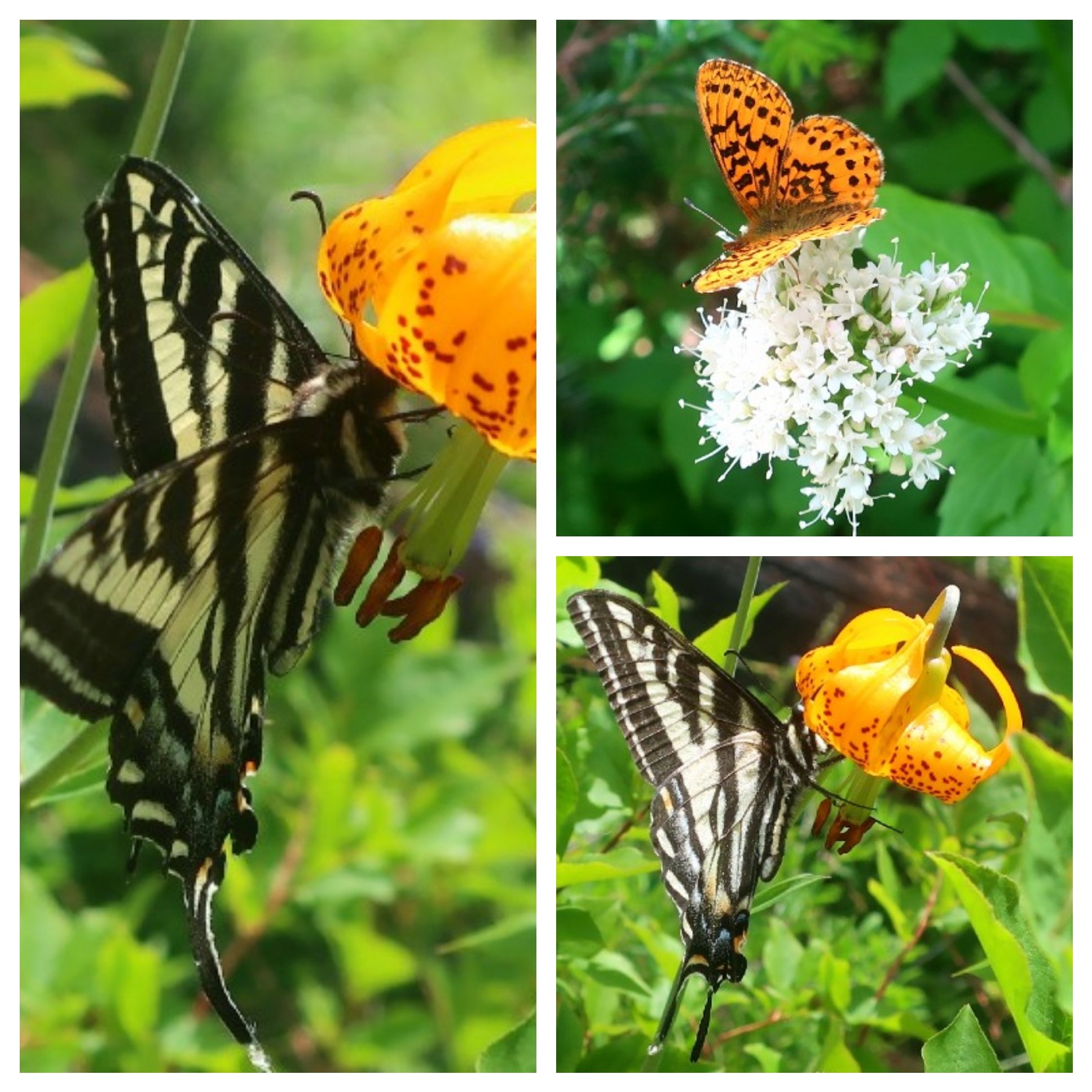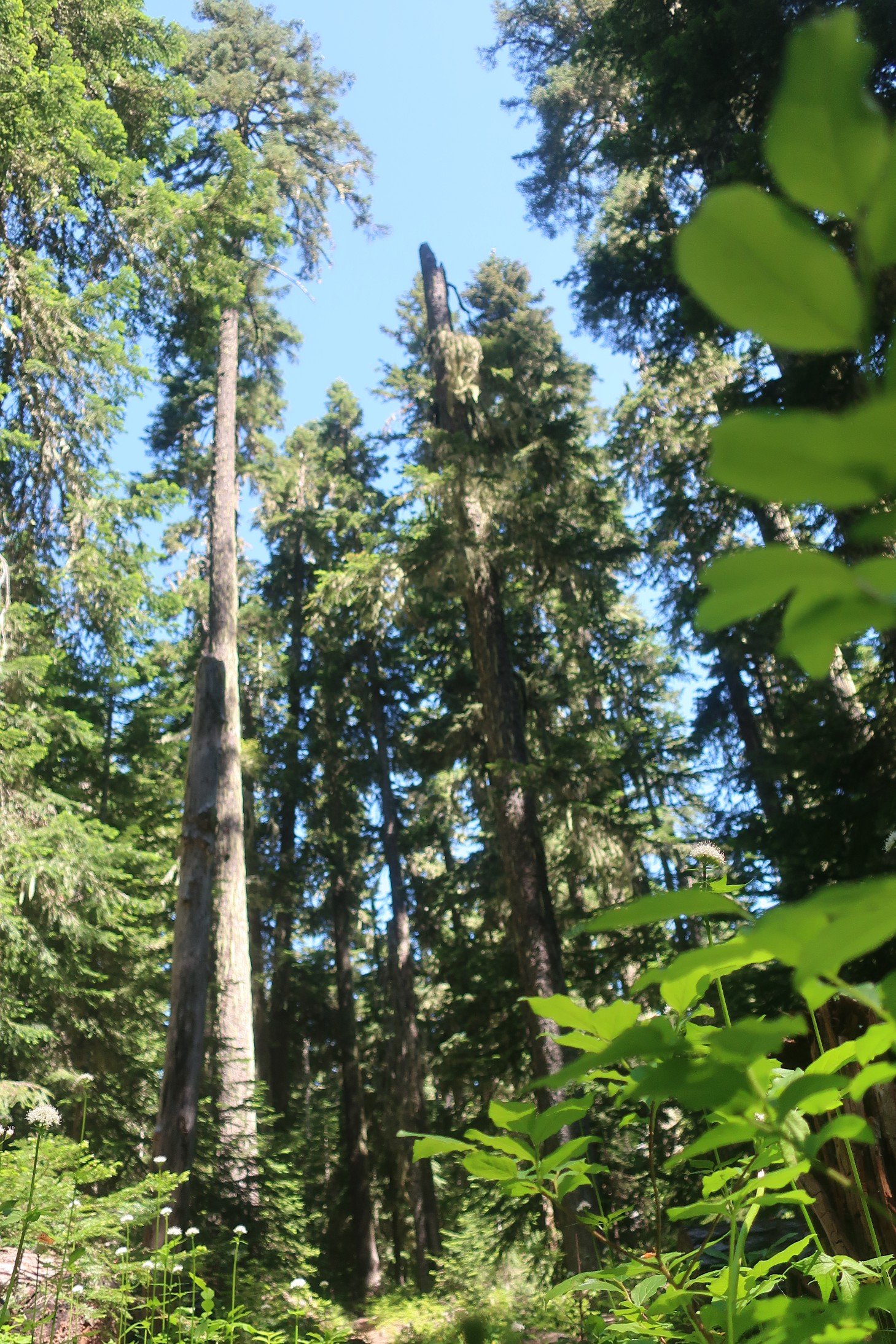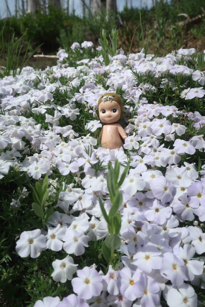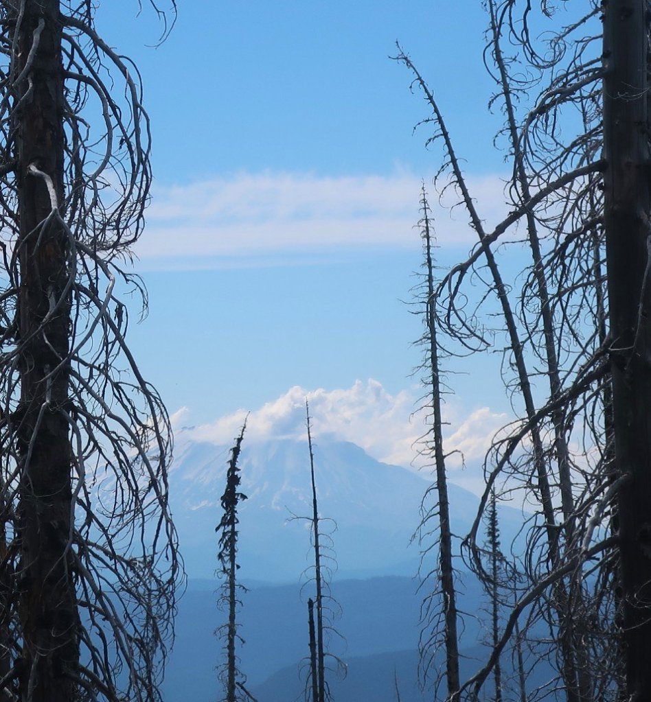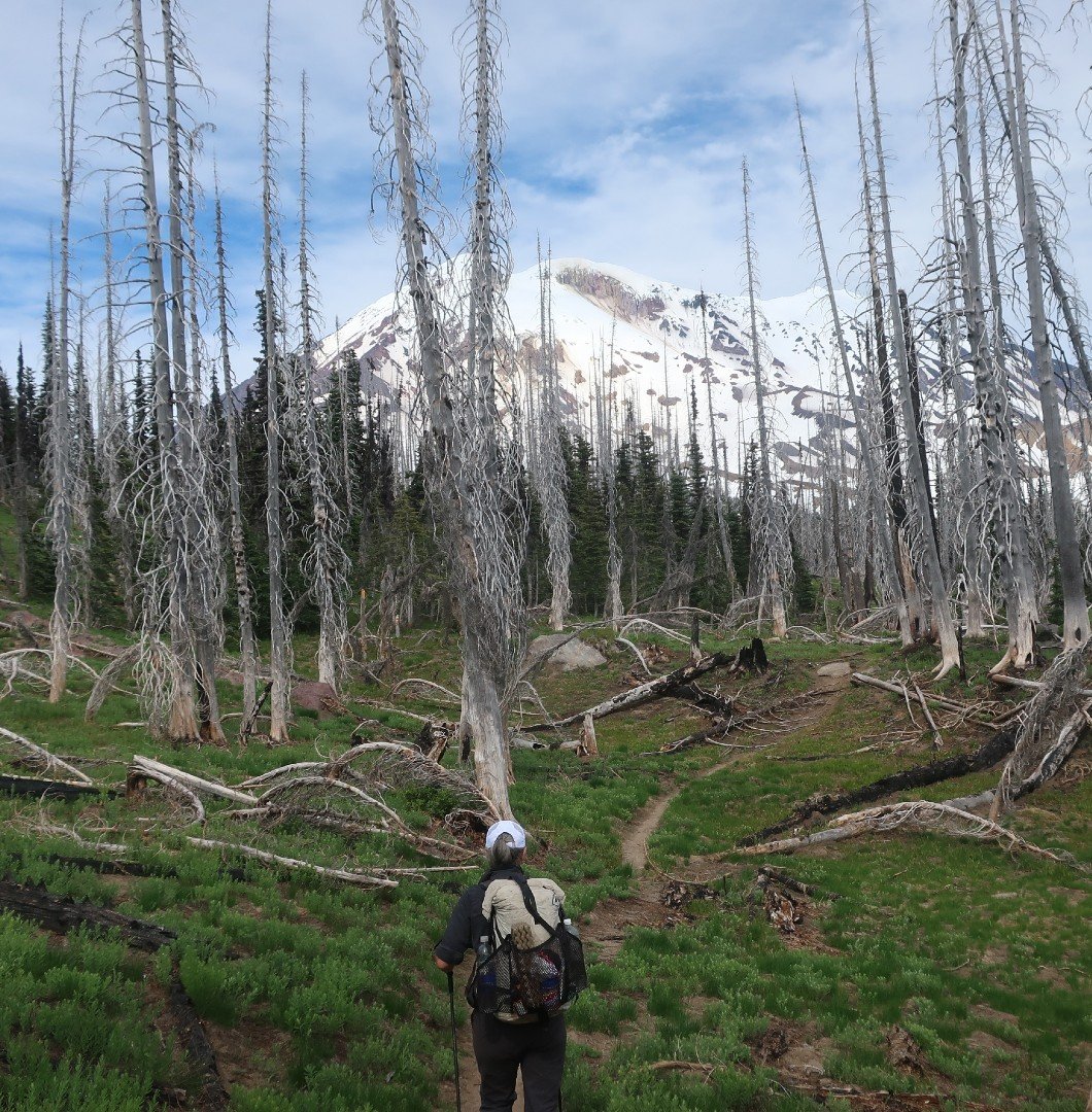 Afternoon hiking was through a huge burn area with views of Mt Hood to the south and Mt Rainier to the north as we wound our way up towards Mt Adams. Spring flower dotted the forest floor which gave me lots of distraction. The most gorgeous butterflies dotted the blooms, spring has sprung. We met a couple of Trout Lake locals out for a day hike with their dog. They were apologising for the blowdowns not having been cleared. Nothing to apologise for, it’s a privilege just to be here.