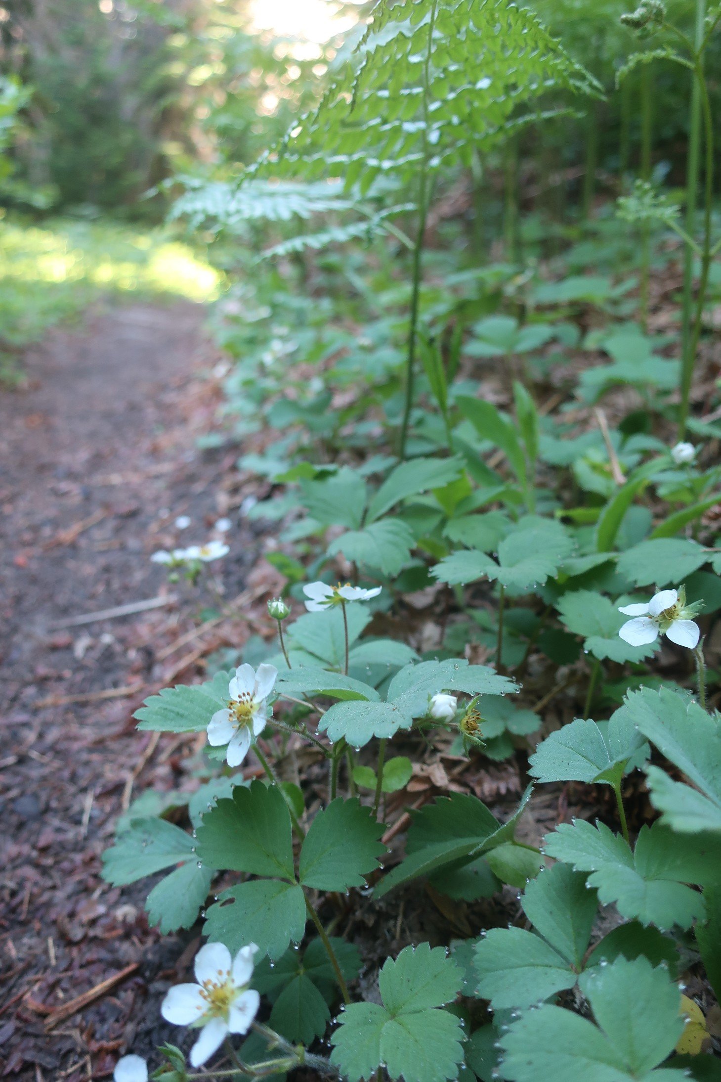 From the creek the morning got cooler with lots of condensation at ground level. Wild strawberry plants lined the trail. It will be a feast for some lucky hikers later in the season.  Here we also met our first southbound hiker. A tall, lean Scandinavian with long legs, no trail name yet as he has not met any southbounders.   He had a big smile on his face knowing the snow was behind him.