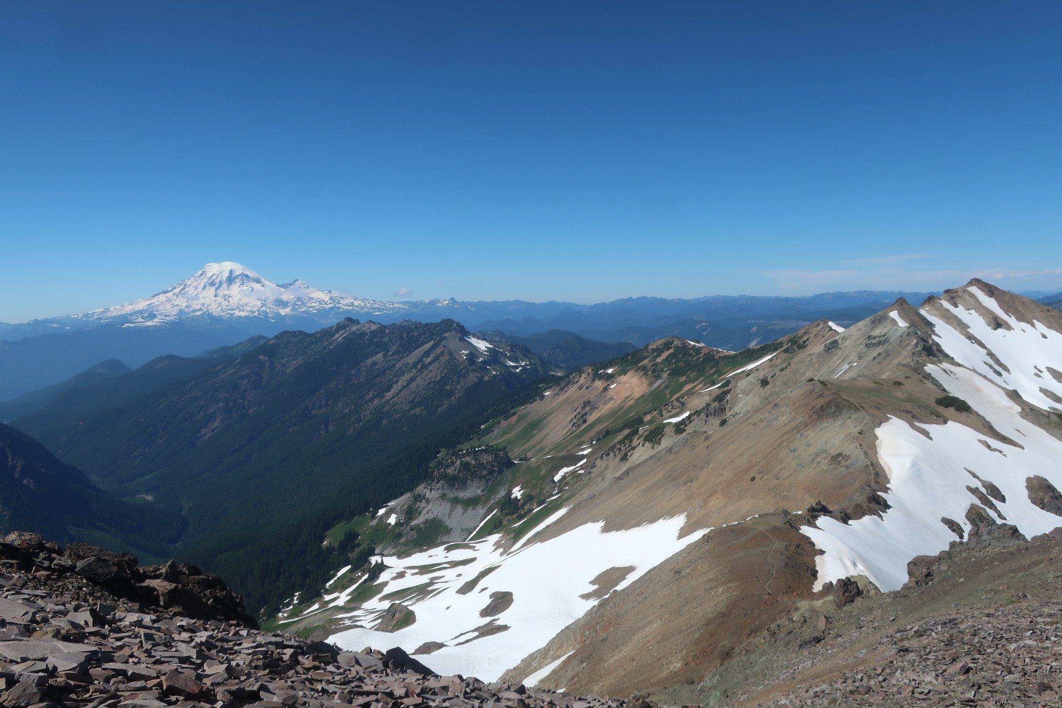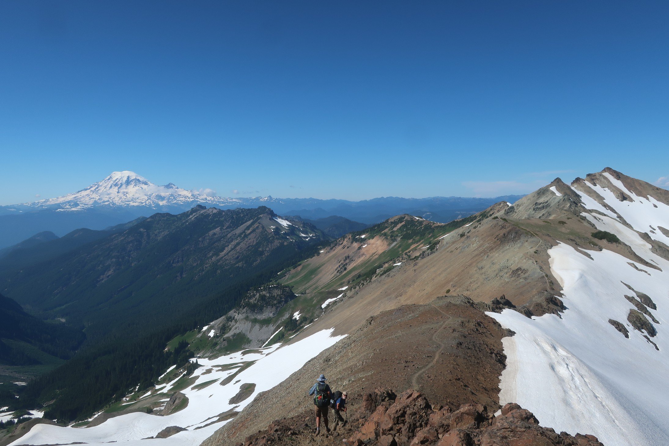 The view across the knifeedge is like being on top of the world, well this part of the world anyway. At over 7,000 ft it is the highest point of the PCT in Washington. Once on top there is a trail all the way up Old Snowy Mountain and we could see some people up there. But for us the knifedge north was enough.