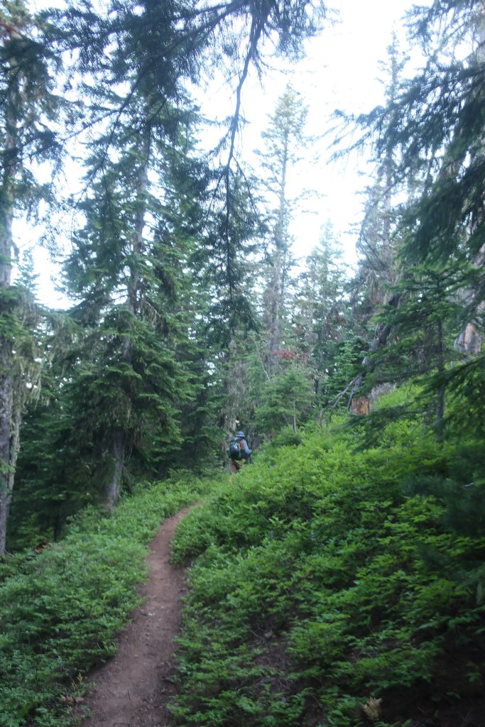 Soon after we were plunged back into the green tunnel on the descent towards the highway. We had run out of water with a few miles still to go. It was hot but there was no stopping to pick up water as we were so close to cold refrigerated drinks at the Kracker Barrel store at White Pass.