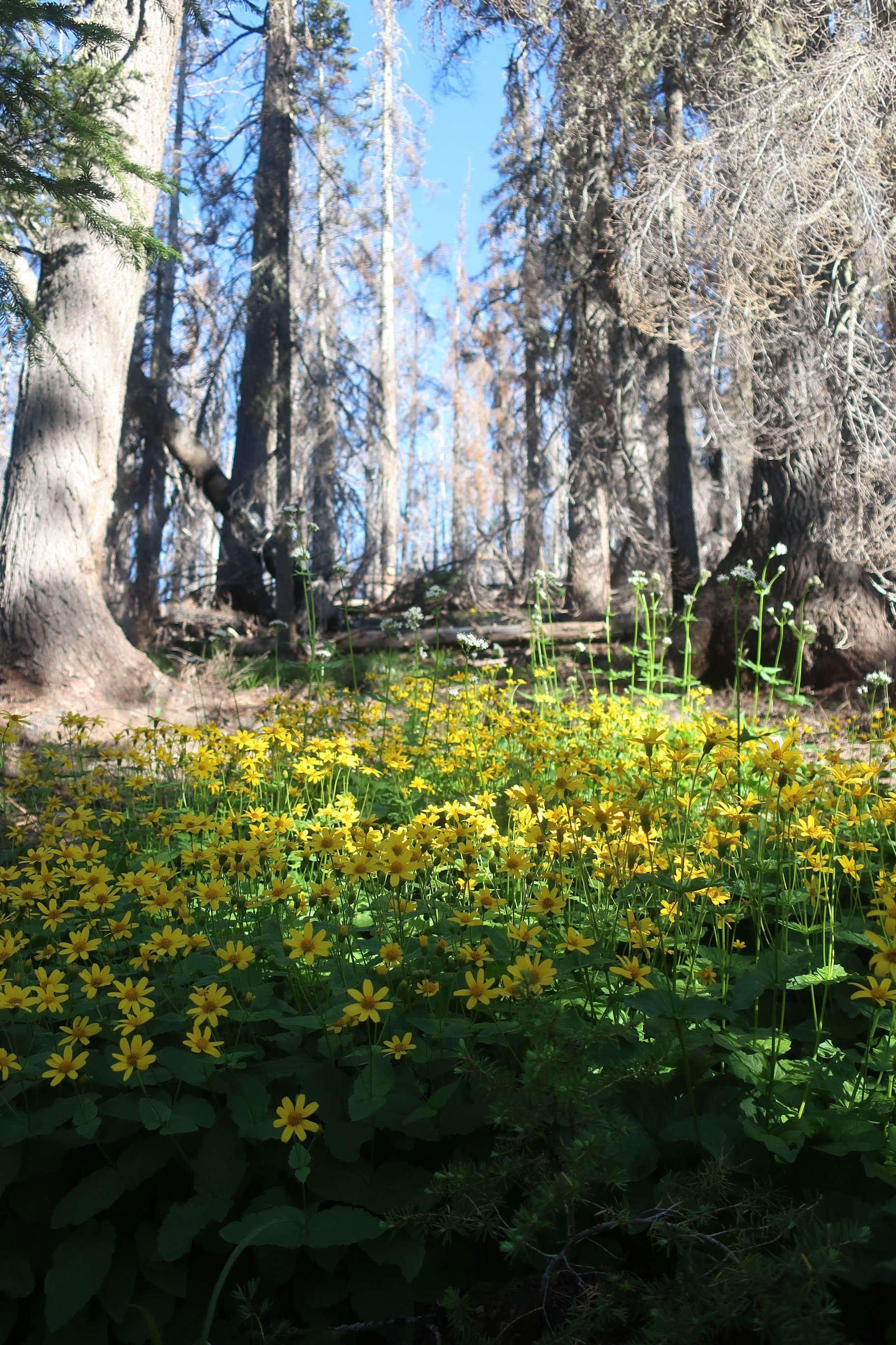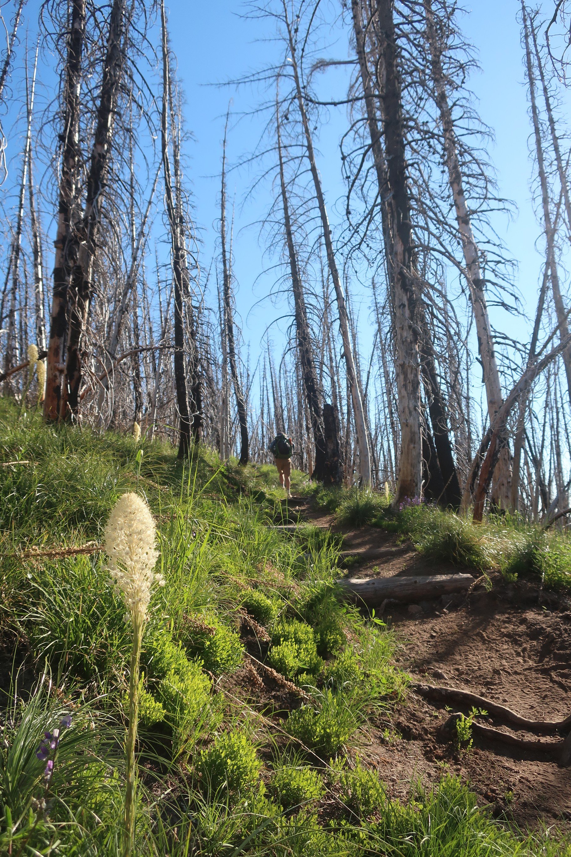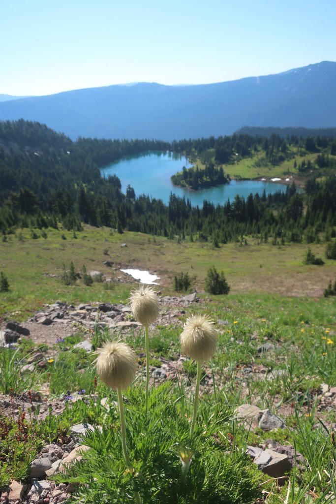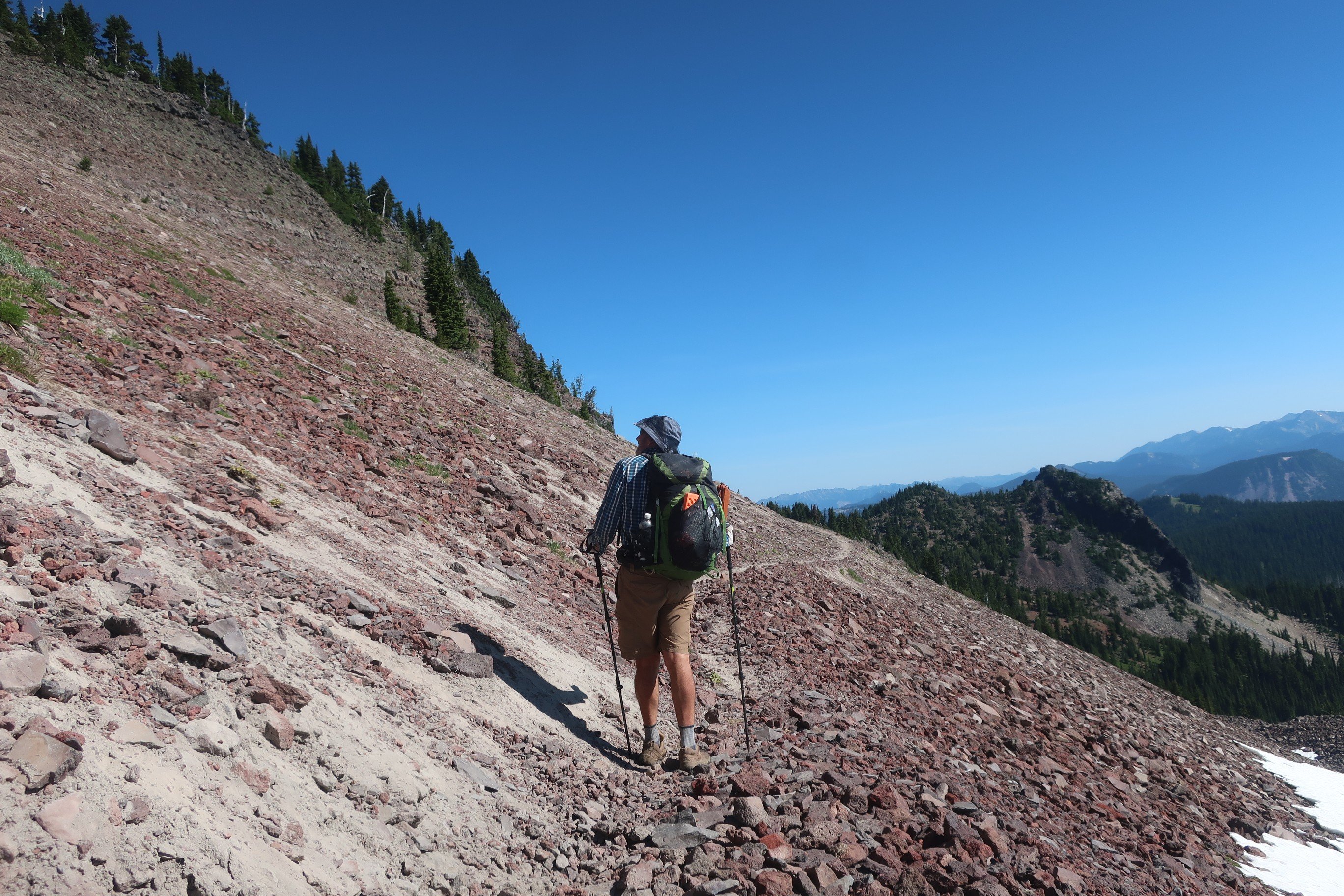There were two brief sections where the trail left the pine forest and we had respite from being bitten. We stopped for breakfast at a spot with a bit if a breeze and a great view towards Mt Rainier. From here we had a nice section of open trail out of the forest. It felt like a break from being eaten alive.
