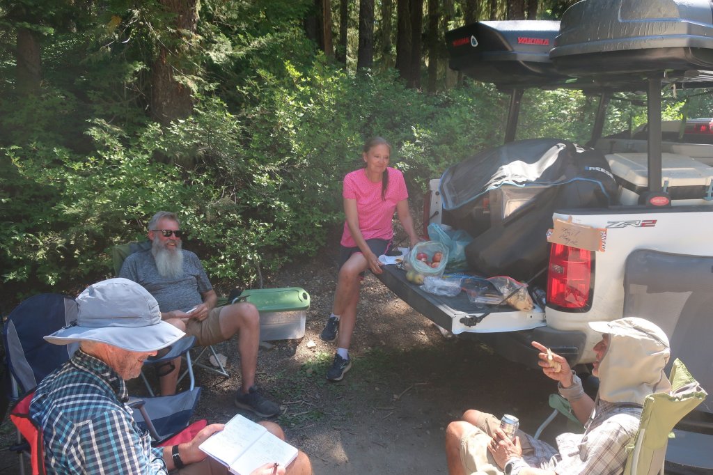 With about a mile, mile and a half to go we could hear the traffic on the highway. And soon we popped out to a carpark and found…..TRAIL MAGIC. It was unbelievable – icy cold Gatorade, Coke, cookies, apples. A couple from Nebraska who are touring while seeing their son off on a southbound hike were feeding a horde of hungry and thirsty hikers. As we sat there more hikers kept popping out of the woods. We left hydrated and grateful for such wonderful generosity, keen to get to the store to pick up our parcel and get a room at the ski lodge above the store. We were so looking forward to a shower and getting out of the heat.