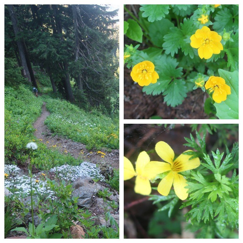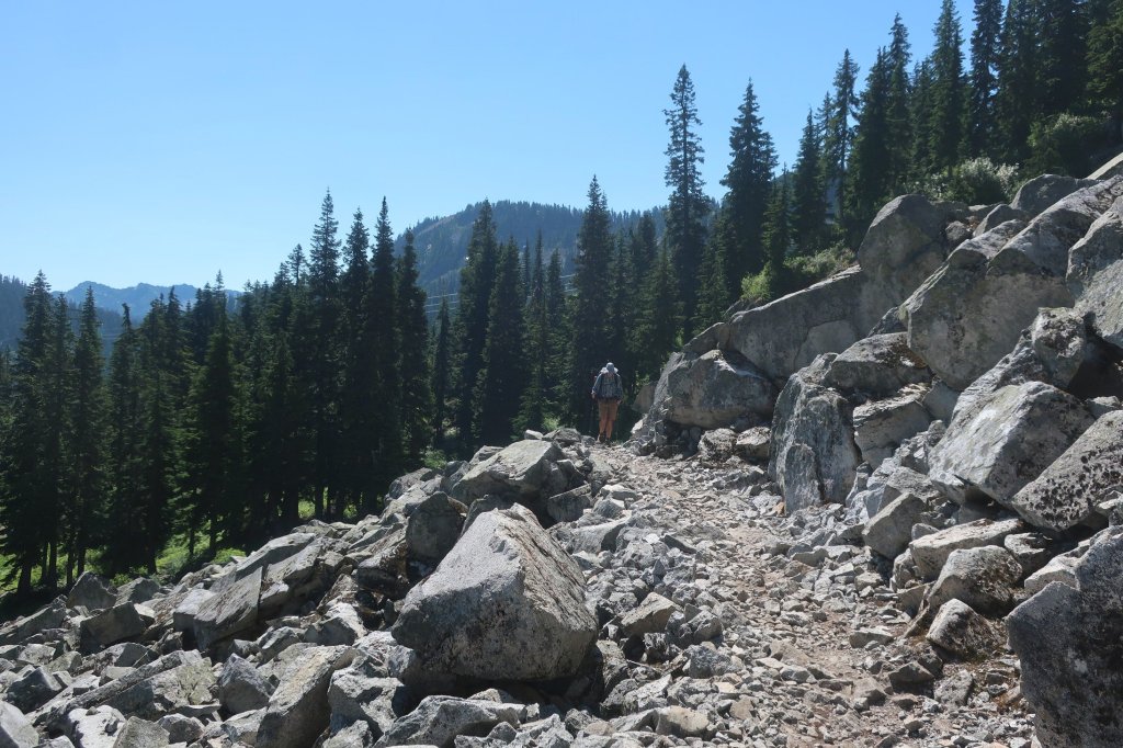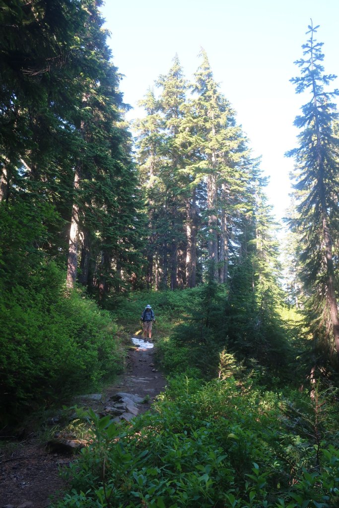 It was hot, sweaty walking in a silent forest. The trail undulated crossing several remaining snow patches. It feels weird to be walking on cruchy snow while air temperature is approaching 90’s F (high 30’s).