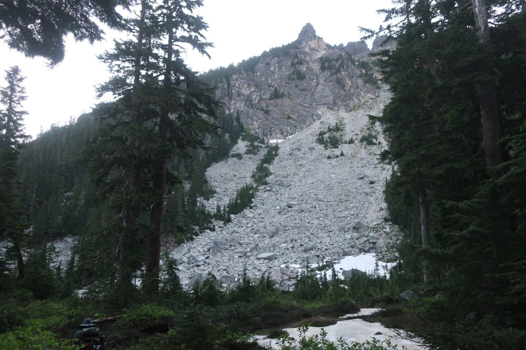 We had camped at the bottom of Piper Pass descent in the narrow Glacial Lake valley. And what comes down most go up as we started the slow climb through rocky mountainside to leave the valley. It always surprises me to look back and see where we had come from. No discernable trail could be seen through the granite boulder terrain looking back towards the pass.