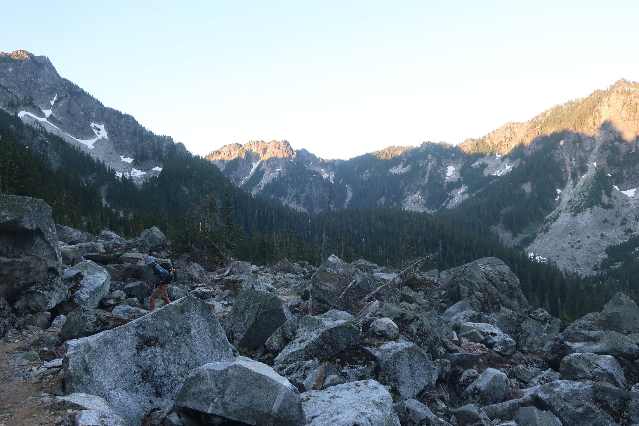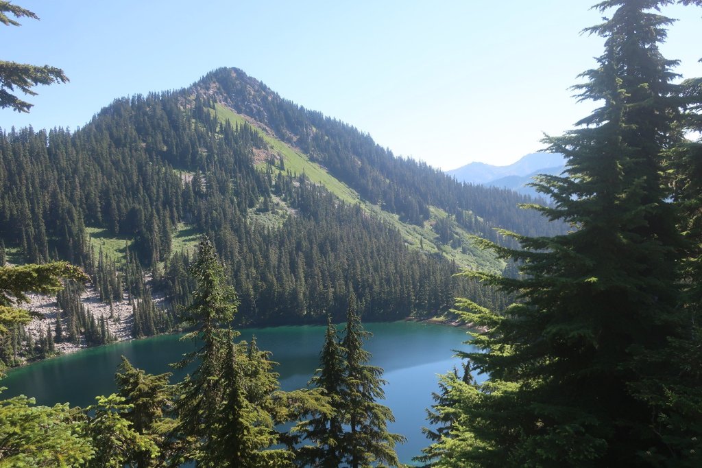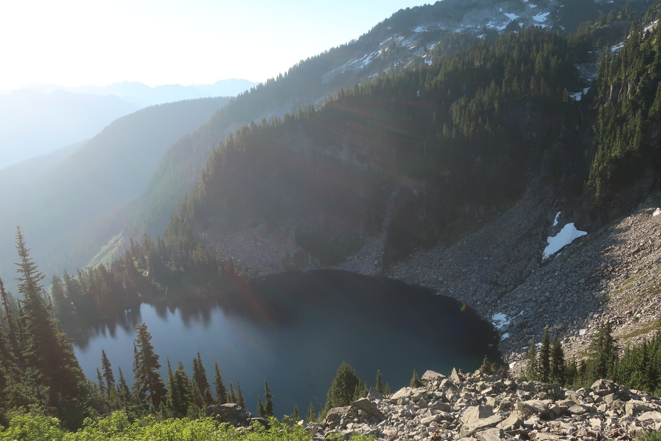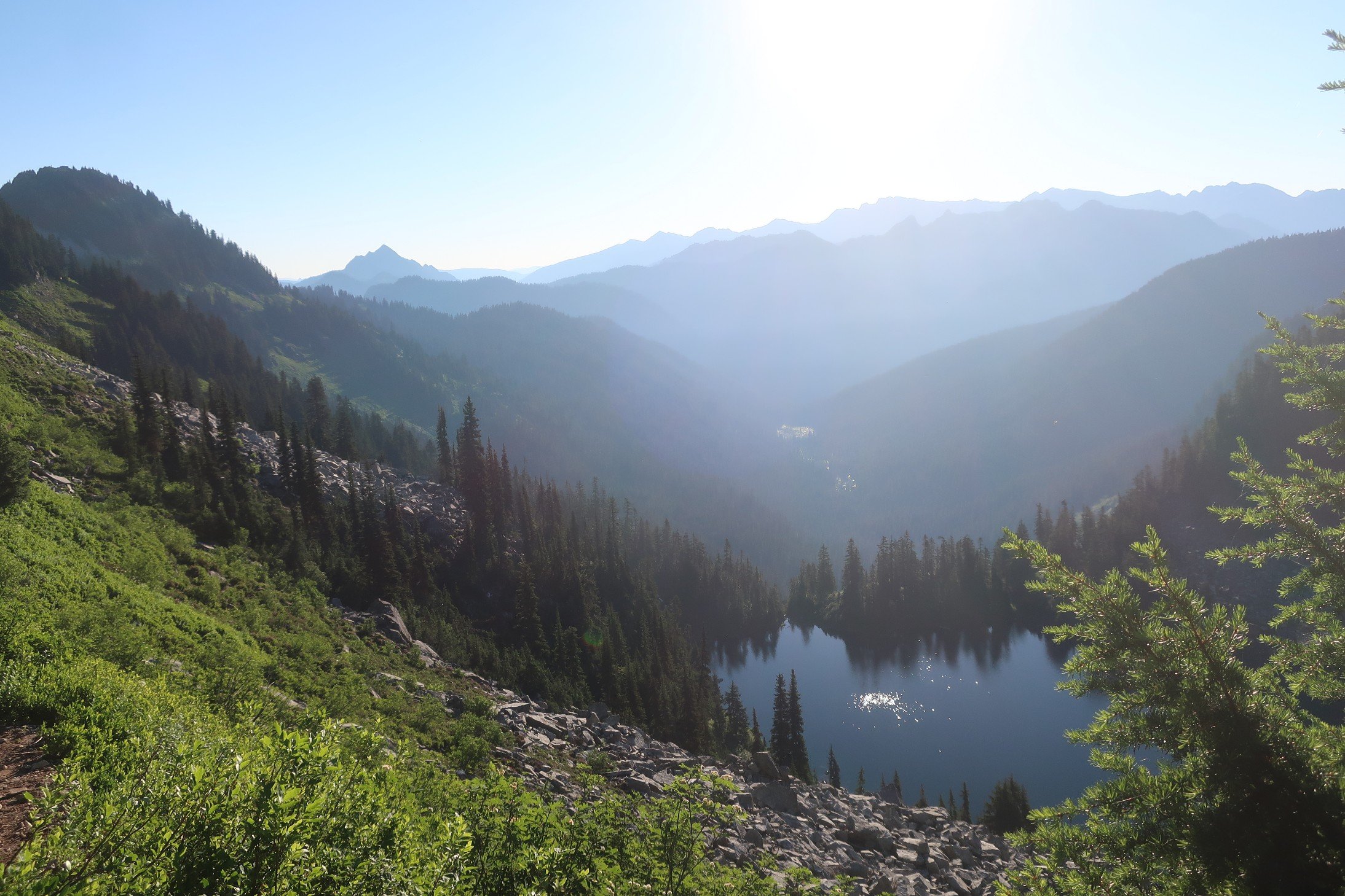 Feeling refreshed it was lovely to walk in the cool morning air with the sound of a creek rushing through the valley below.  A few sweaty switchbacks and we were on a pass looking down towards another lake  Trap Lake. The valley below was bathed in the morning sun and a heat haze was clouding distant mountains.