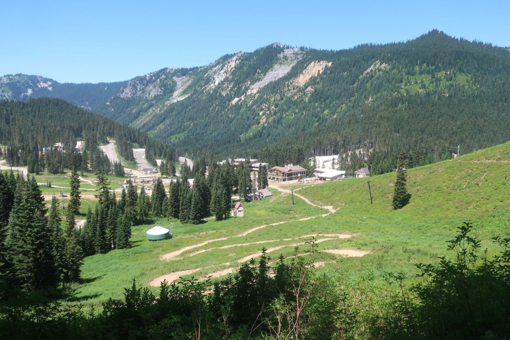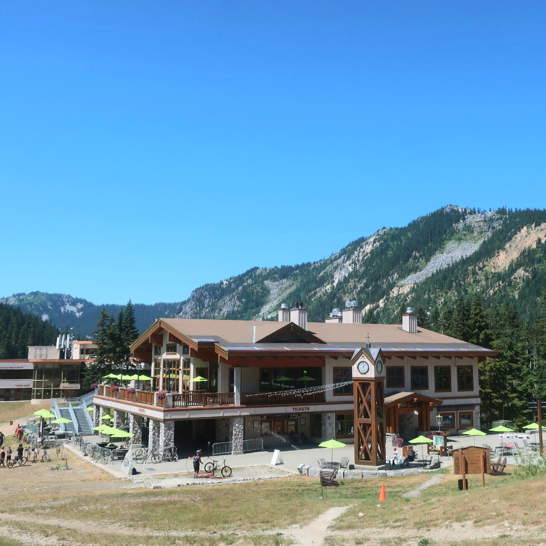 We had run out of water and all I could think about was an icy cold drink. I just wanted to get out of the sun, it was so hot exposed on the mountainside. It felt like we would never get there. Being a Friday Stevens Pass Resort was a hive of activity with mountain bikers raising sust in the midday heat.