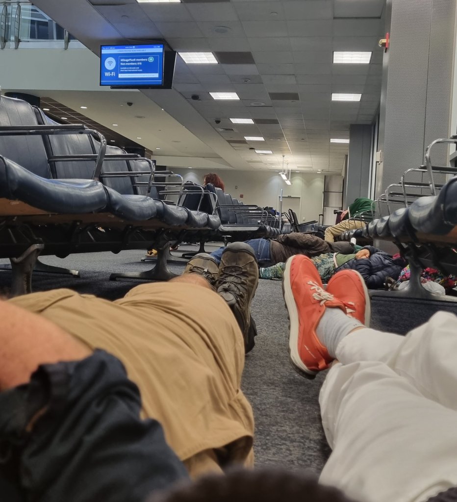 We found a flat spot to stretch out on the ground and despite our bodies aching with lack of sleep and fatigue, it was cold and sleep did not come easily. As we couldn’t sleep we went for a walk through the terminal.