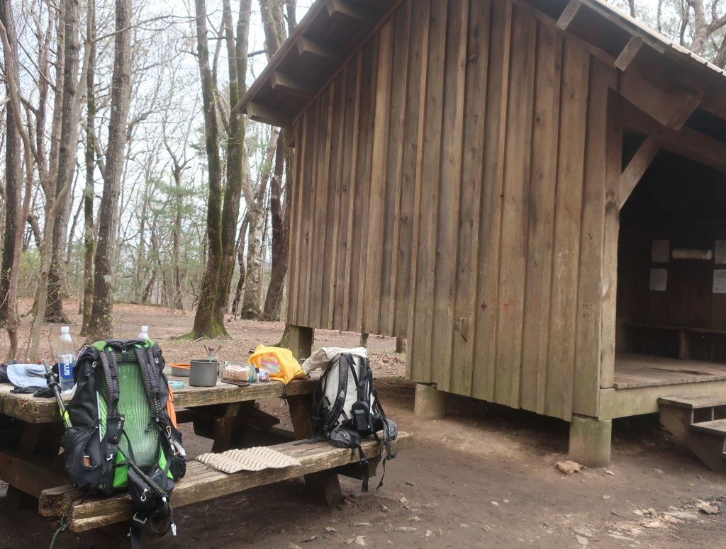 We stopped for lunch at the Hawk Mountain shelter (mile 8). There was enough sunshine to dry our tent and other wet gear while having lunch. What a difference a day makes.
