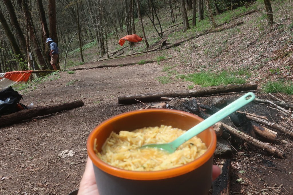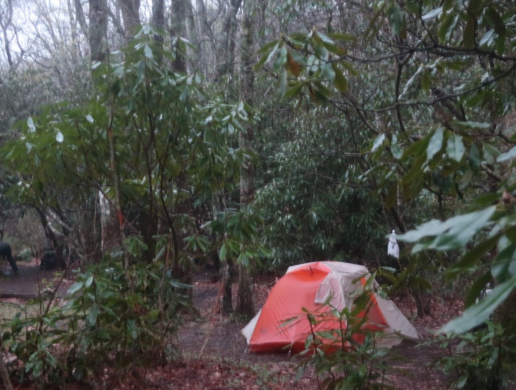 We passed Rock Gap Shelter around 4pm afternoon, a few tents were dotted around. It was tempting to stop here, the shelter looked quite nice and the campsites were in the sun. I was begining to imagine how nice it would be to be horizontal, listen to a book before the sun goes down. But we had agreed earlier we were going to hike till about 6pm. About half an hour after leaving Rock Gap the skues turned steely grey and soon rain followed. We were caught in a rain squall that showed no indication of passing. Climbing up Wallace Gap we were lashed by the rain and the wind but we had no choice but to keep moving. The rain lasted about an hour. Most unpleasant especially when exposed to the wind up on the ridges. It was such a relief that the trail dropped down off the ridge towards Winding Stair Gap. By the time we made it to the road, the sun was back out. Although it was low on the horizon so offered little warmth. It was a relief to find a campsite right on 6pm. A great spot by a creek, surprised to see no one else camped here.