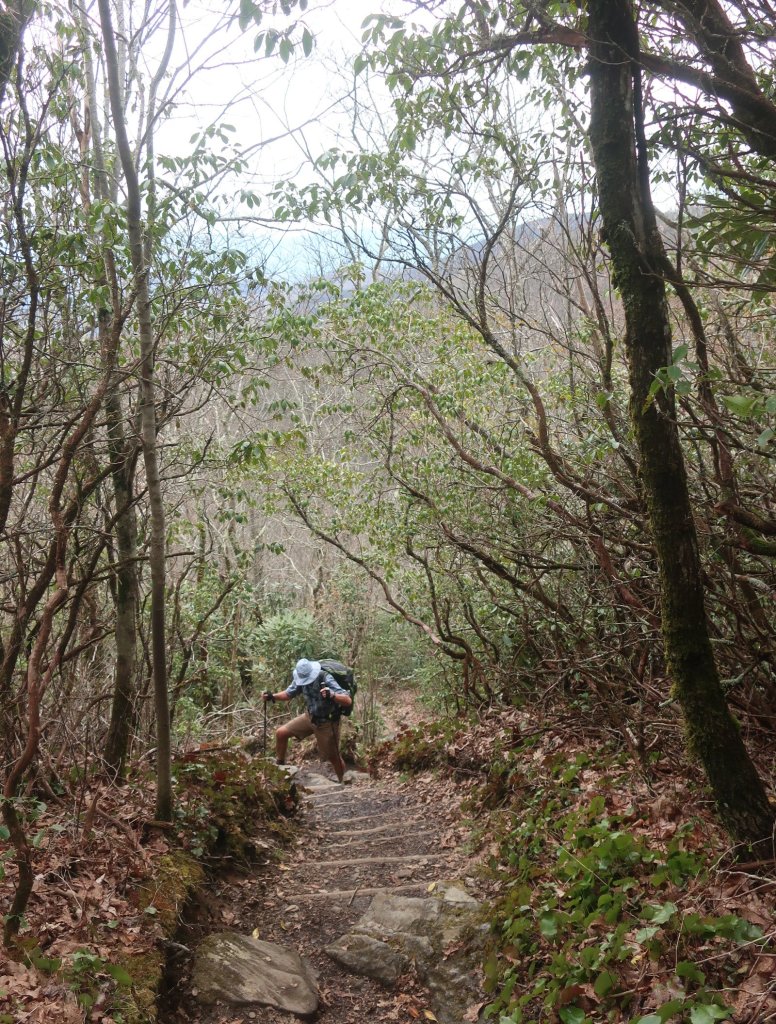 As we had lunch early I was worried that the afternoon would drag on a bit. And it kind of did. Soon after lunch at Mooney Gap we had a gnarly climb up Albert Mountain which has a fire tower on top. The climb was not long but it was steep and rocky and lung busting. It was a relief to be rewarded with great views from the top. The valleys below are the subject of academic studies on watershed management . Everything looked so lush and green.
