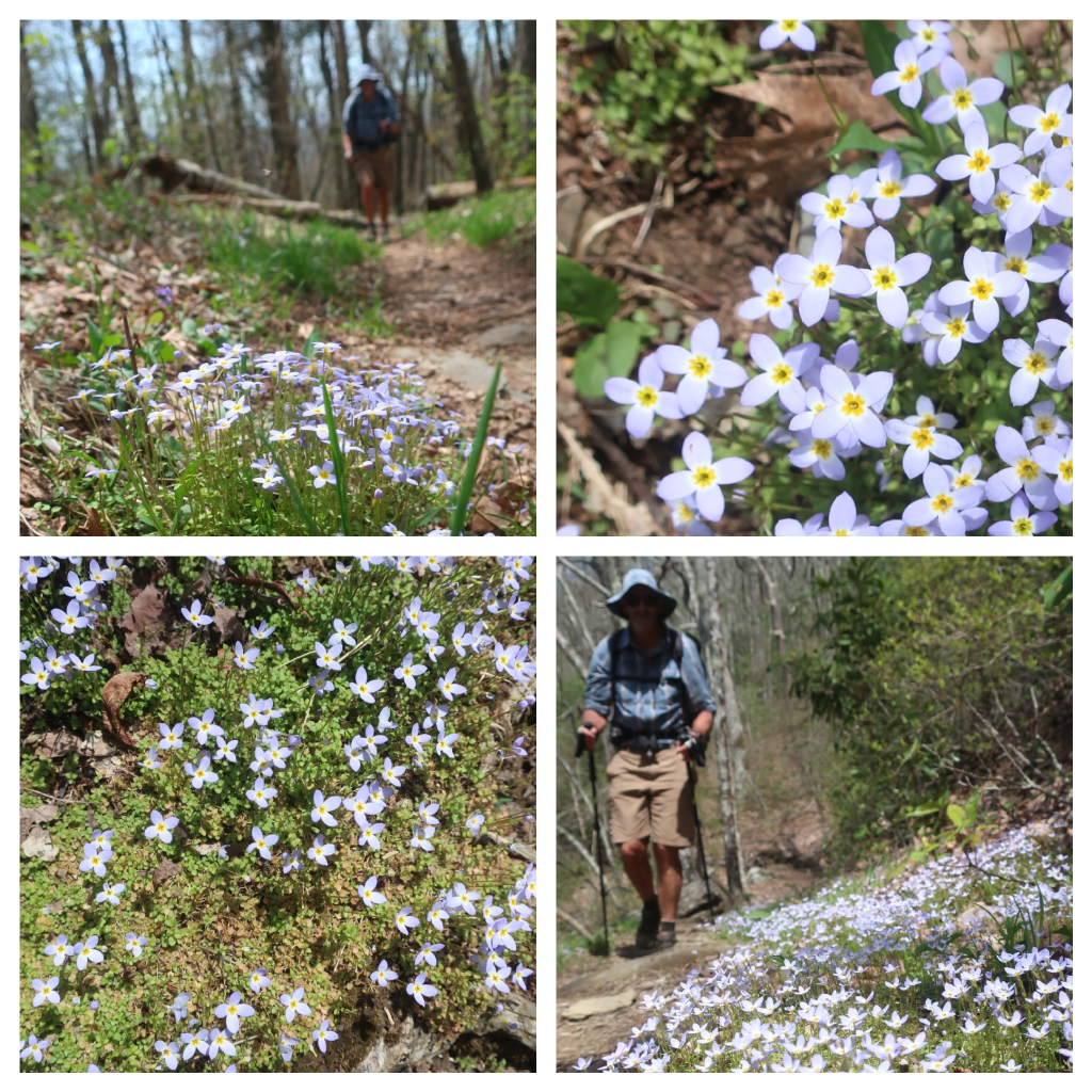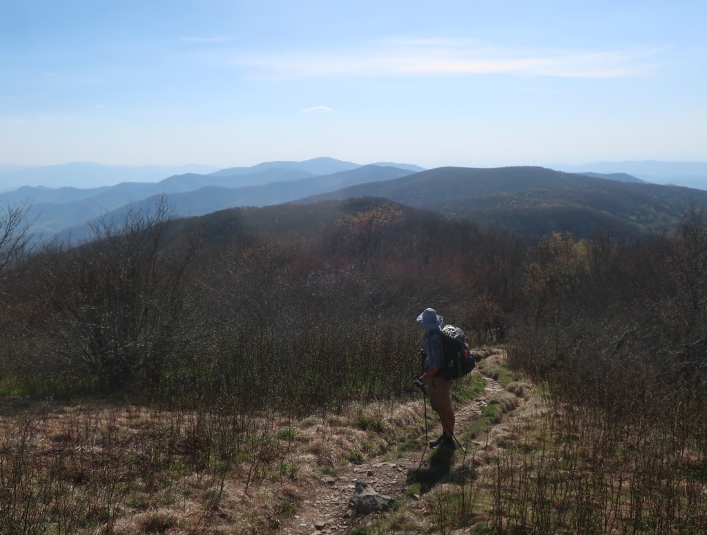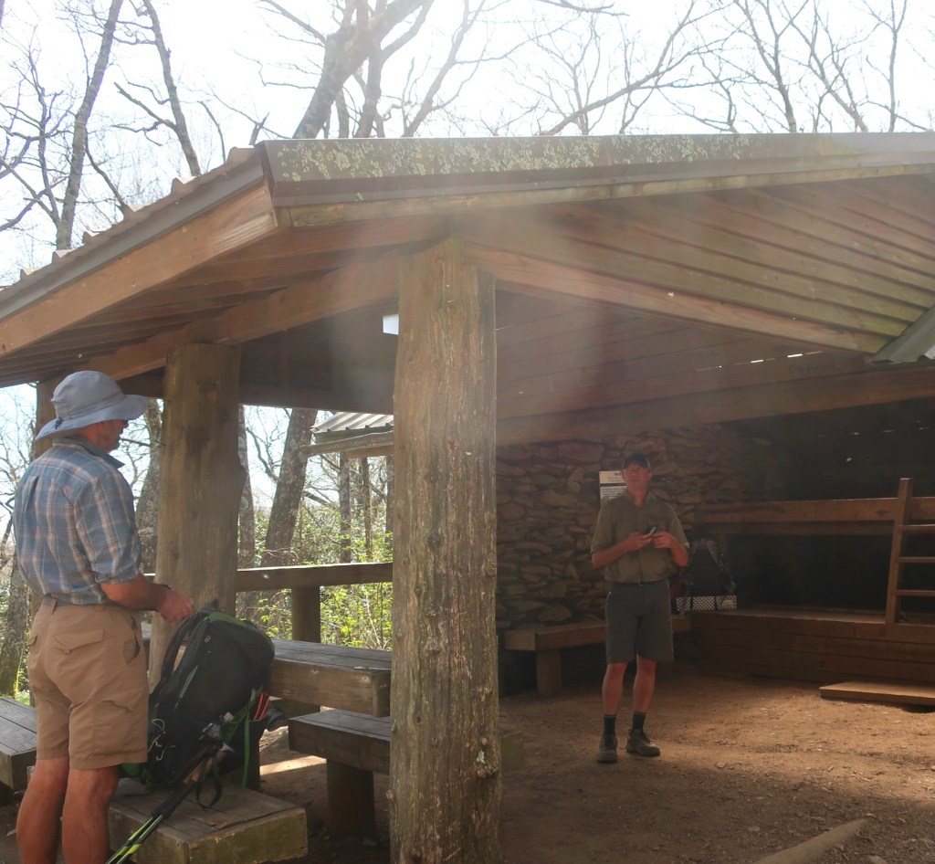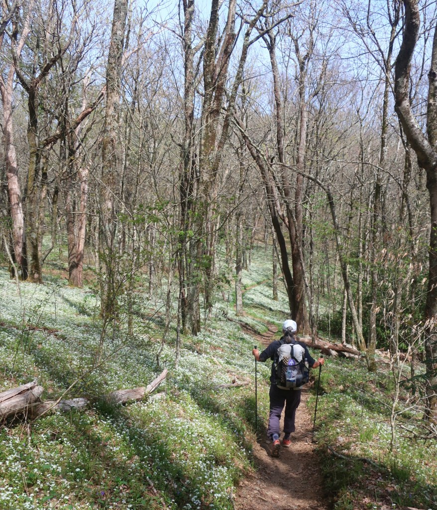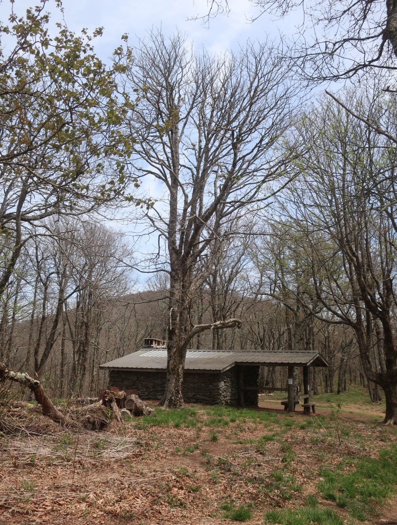 Early afternoon hiking offered no views of the elusive blue ridges we can climpse through the shruby looking trees. We stopped to filter water at one of the most beautiful shelters we’ve seen so far. Made of stone, it was set in a massive field of white flowers. Looked quite magical. A hiker we met yesterday, Cory from Mississippi, caught up to us here. We talked to Cory for a bit while filtering water. I loved hearing him speak, such a lovely accent.