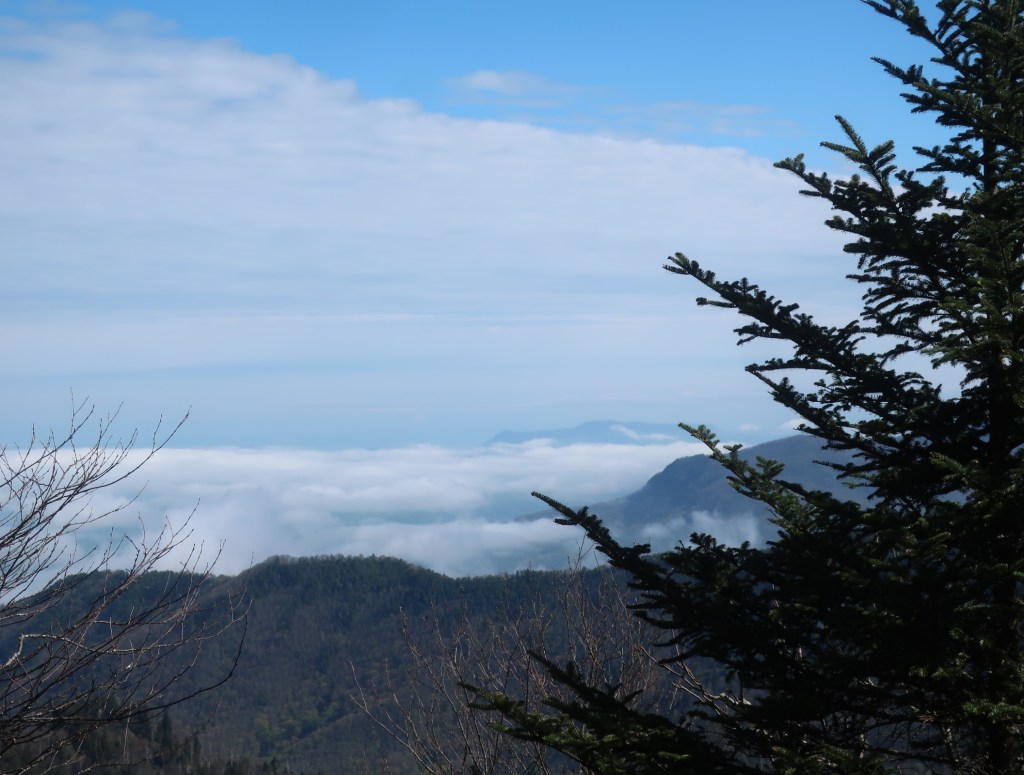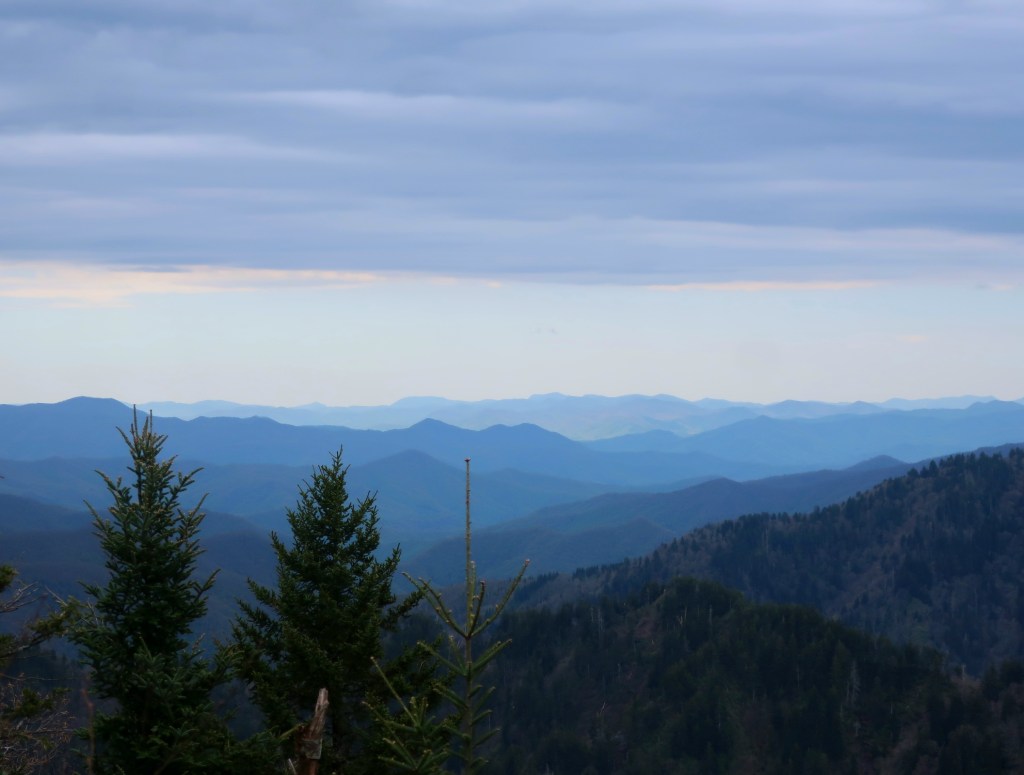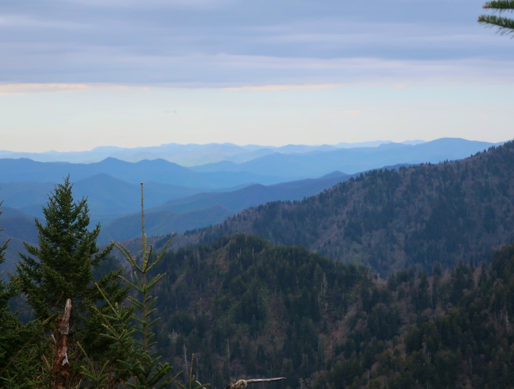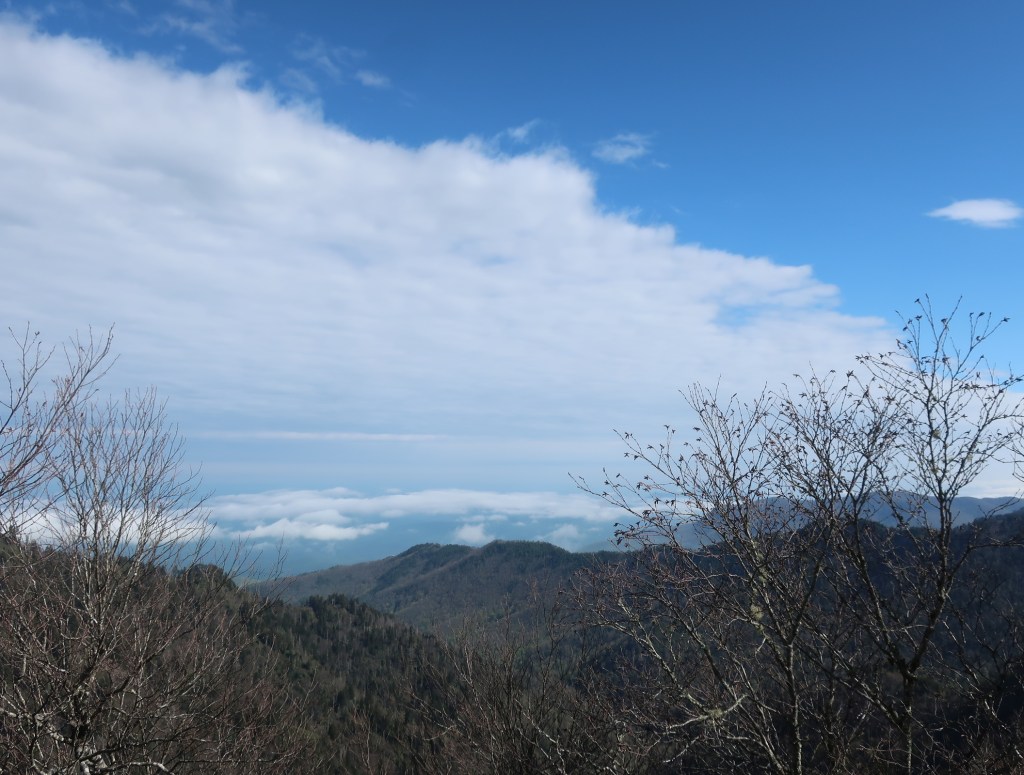 From the Bunion we had the cold wind and the trail to ourselves. An occasional break in the trees gave us the most magnificent views of a layer upon layer of blue ridges. Simply breathtaking.