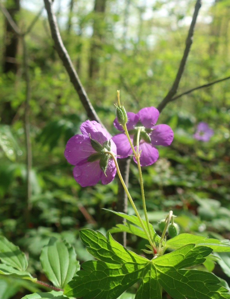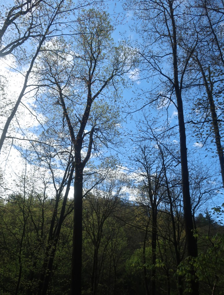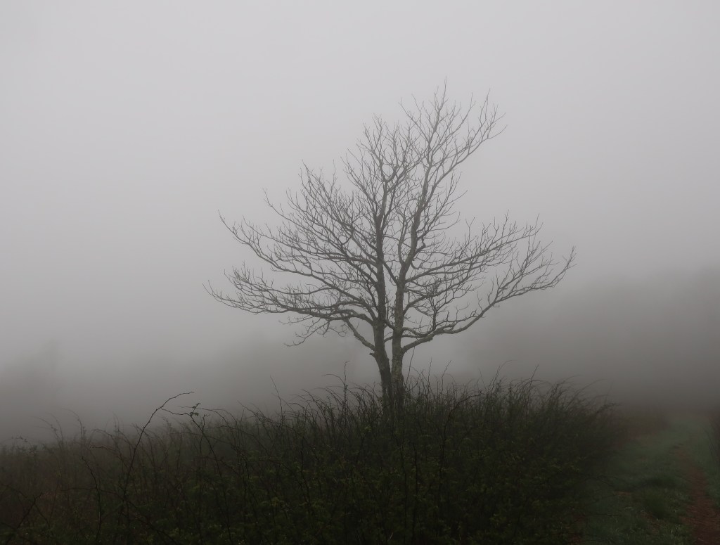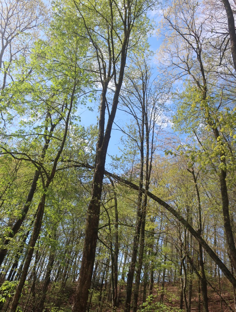 It has been a lovely morning hiking in sunshine with occasional views of surrounding landscape. The fog was still clinging to the distant mountains tops and the new foliage in the trees shone in the sunlight.