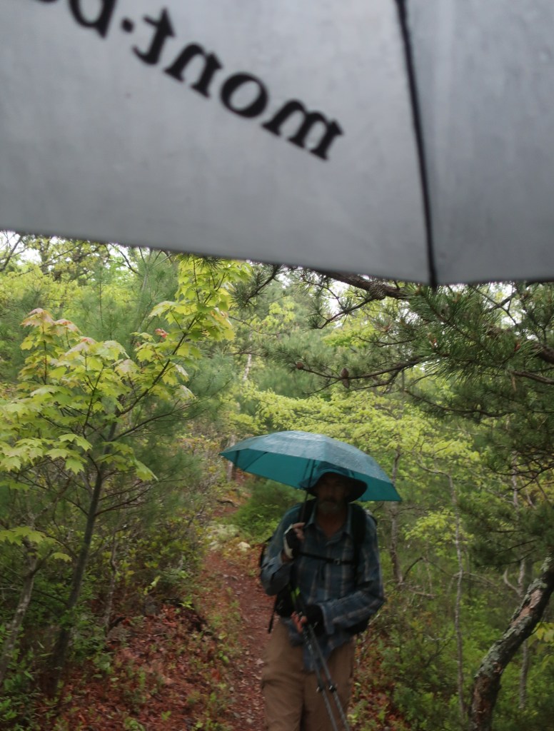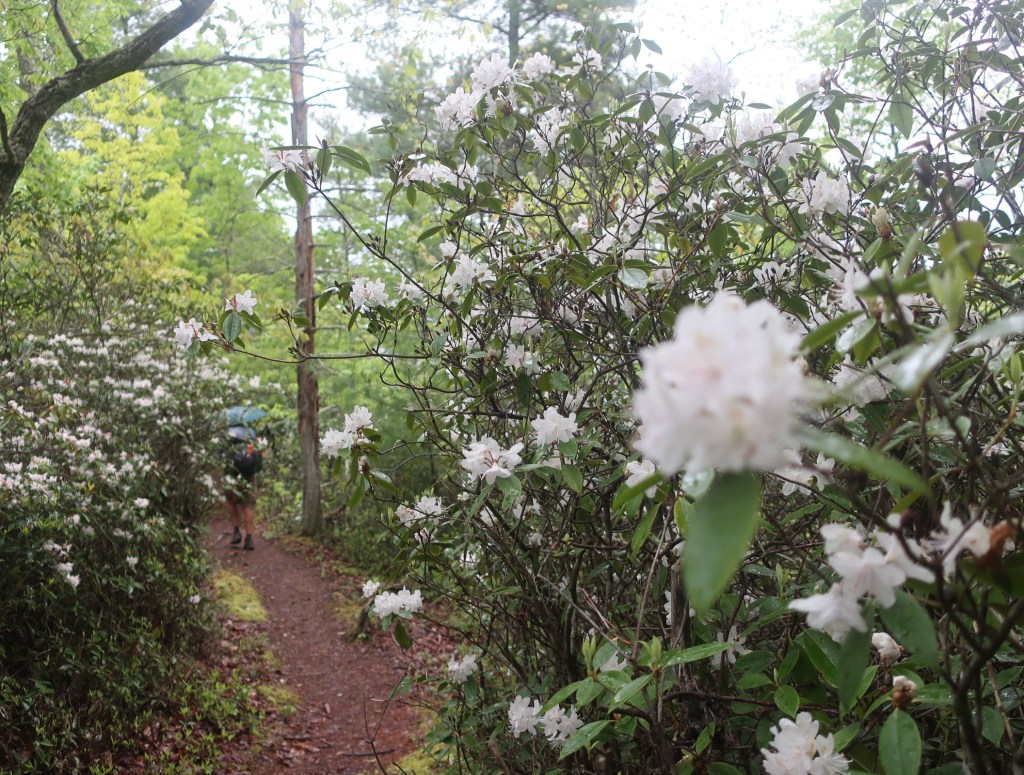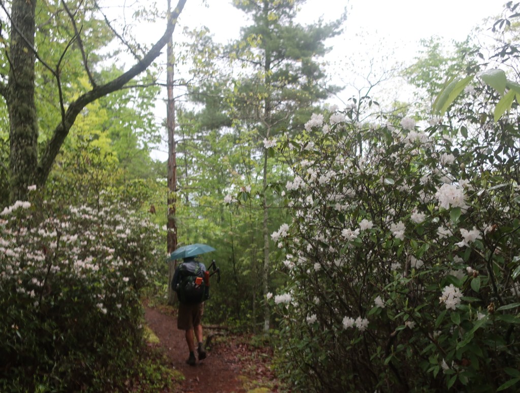 Rain followed us all the way down the mountain. Stands of white azalea lined sections of the trail. We made it to Uncle Johnny’s just before 8am.