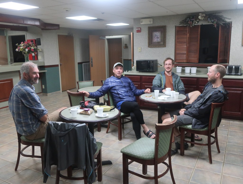 We were soon in the foyer of the Super 8 Motel having breakfast while waiting for our room. We met a few hikers here speaking mostly to the Guru, Jurgen and Fabian. Guru is a GP from San Diego and used to race mountain bikes professionally. He was hiking with Fabian and Jurgen who are from Germany. They met on the shuttle bus in Atlanta and have hiked together since. Too many funny stories to share but it was a pleasant couple of hours before they checked out to head back to trail and we checked into our room. The usual town chores followed before we could put our feet up and catch up on news.