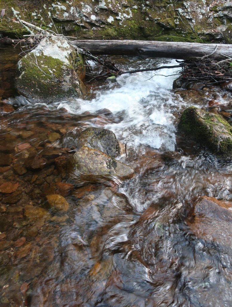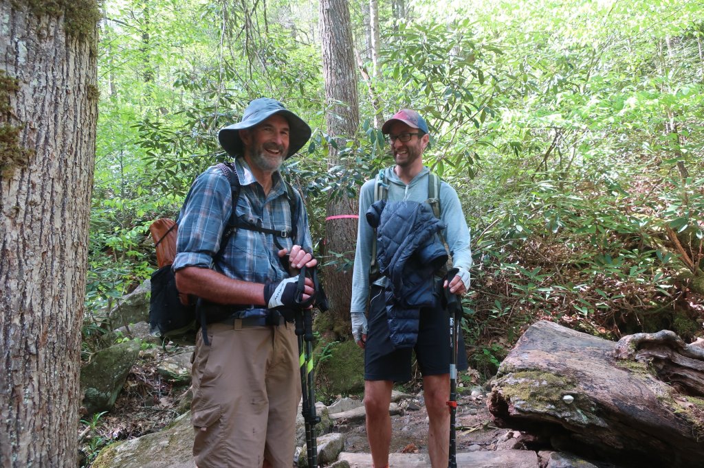 After lunch the trail for quite gnarly. The ascents were much steeper and the trail was so much more rockier underfoot. I was pleased I had new shoes. My feet were feeling a bit tenderized as the afternoon wore on. Hammer felt fine and was keen to push his shoes till the halfway point. All day we had one brief glimpse of the distant valley otherwise we were enclosed in the green tunnel. Late afternoon we stopped for water at a gushing stream. While we were there three hikers passed us. They had just started on their through hike in Damascus and were taking it easy while getting their trail legs. We passed them about an hour later when they stopped to cool off at a creek.