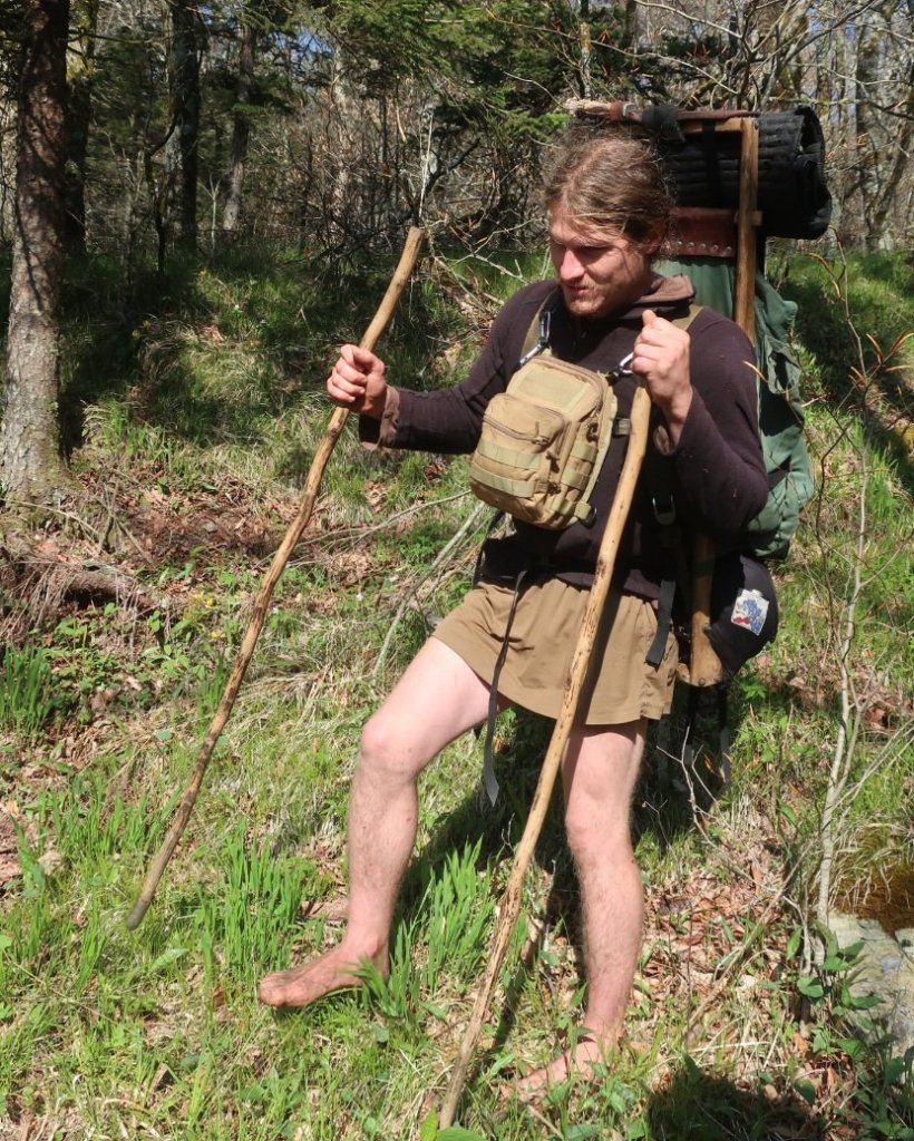 We first met Hand-made, whom Corky continued to call Home-made, just above Watauga Lake. Hand-made is an interesting person. He is hiking with a wooden frame pack he made himself when he was 18. He has attached a heavy duty army shirt to the frame which he loads with his hammock, sleeping gear and food. His diet is exclusively Pop-tarts and oats mixed with peanut butter and chocolate chips. He has chosen to walk barefoot, which must be incredibly challenging when its been cold and on the rocky sections of the trail. He starts early and finishes late and is always cheerful when we have come across him. He doesn’t stay in towns, just passes through to resupply. He always remembers our trail names and has a great knowledge of the trail. He and his father maintain a 4 mile section of the AT trail around Mile 880 in Virginia. We last saw him near Mt Rodgers in Virginia.