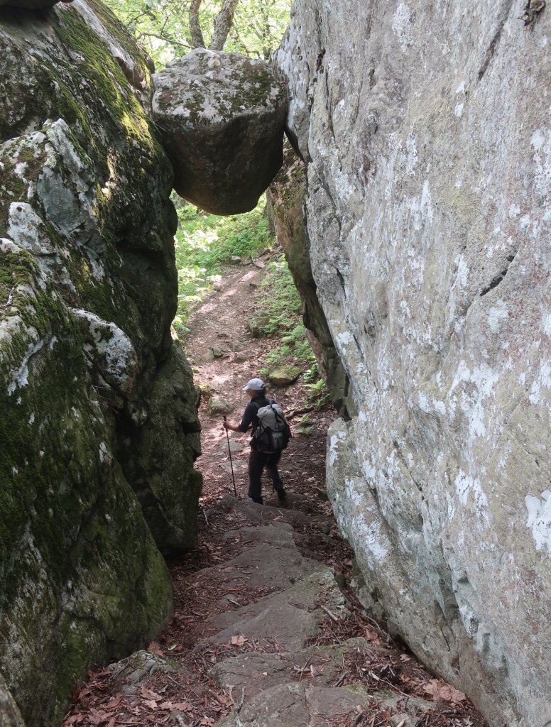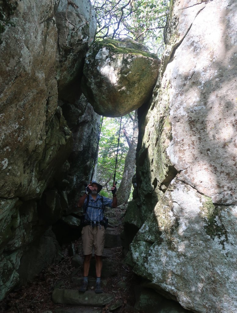 We also crossed through a rocky feature called the Guillotine. It’s a rock that looks like it’s fallen through a crevice and it’s been caught up above. The trail passes underneath. It looks like just a slight tremor would bring the rock crashing down.