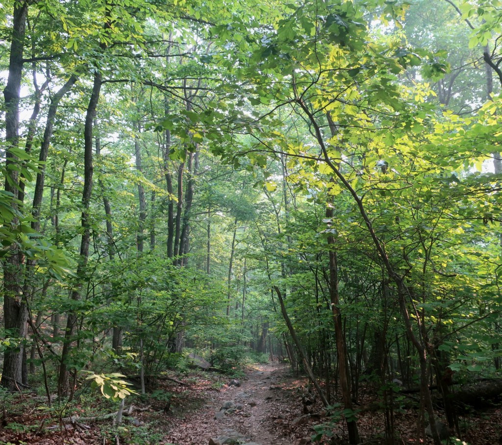 The morning was lovely and cool, perfect hiking temperature but the smoke from the Canadian fires has made it under the tree canopy giving both of us a bit of a tickly throat. Smoky haze was visible through the gaps in the tree canopy. Coming off the first climb of the roller coaster we could see the sun like a red ball projecting through the gaps in the tree canopy.