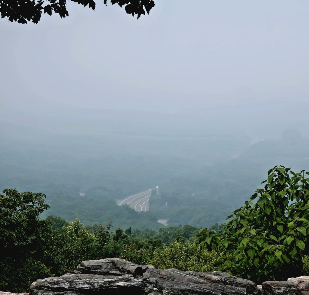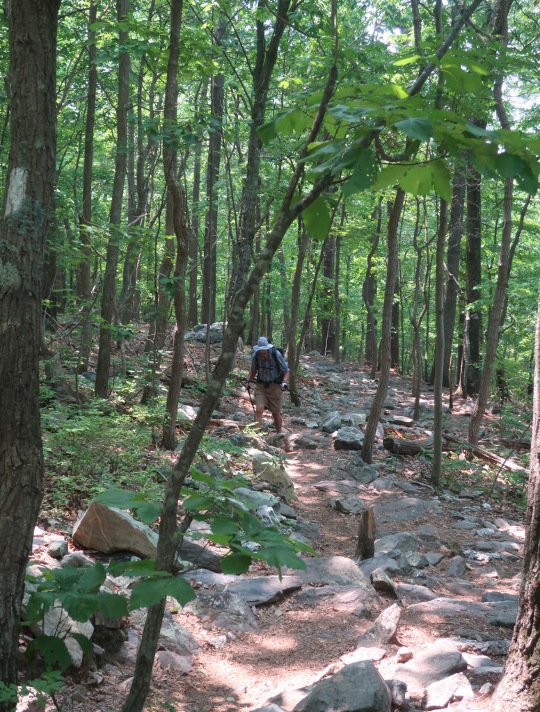 All morning we were up and down until we started to approach Virginia Route 7 at Snickers Gap where we though we would be descending. The sound of roaring traffic could be heard for some time. We started getting close to the road and then the trail deviates and takes a really sharp uphill turn towards Bears Den Rocks. This climb seem to go on forever. It was a bit disappointing to get to the top of the rocky outcrop which is the Den and find the views were obscured by the smoky haze.