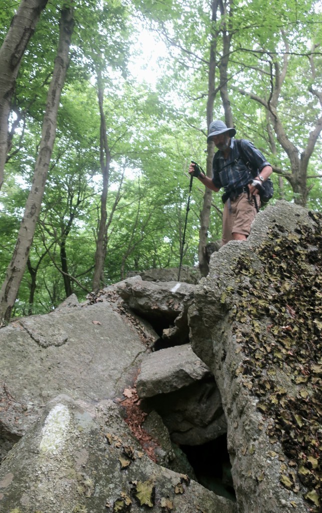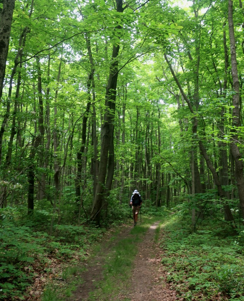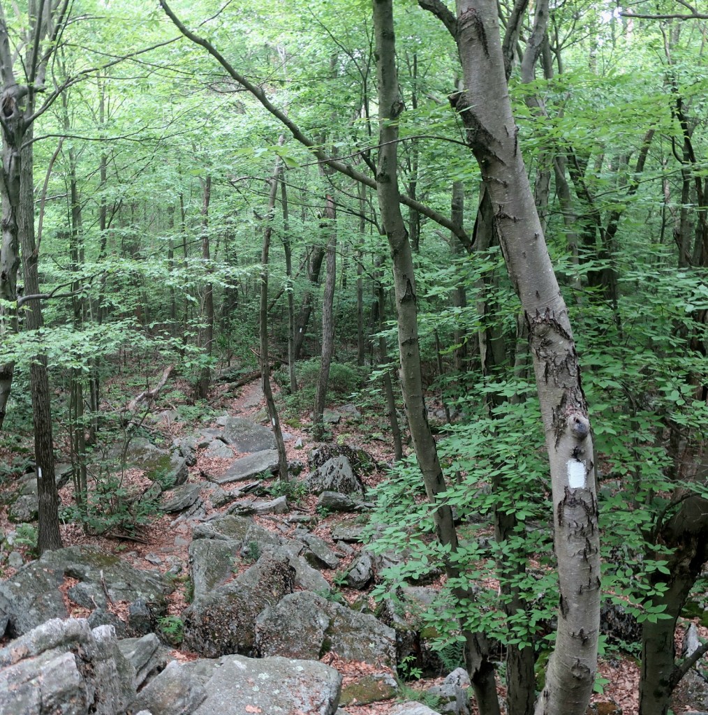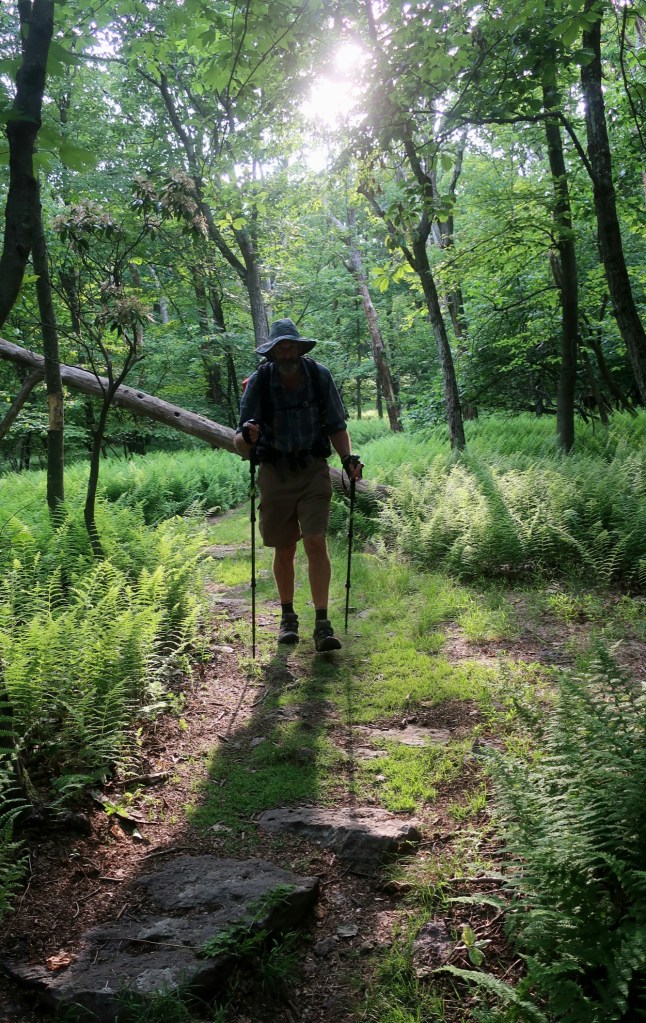 From Hulk Mountain Road we descended down to a creek which we crossed on a small bridge and from there we had a long ascent up to a ridge line on which we stayed for quite a few hours through the morning. We were sweating profusely in the morning humidity. The wind whistled through the tree tops and a roar of distant planes could be heard but not quite drowning out the sound of the bird song chirping in the tree tops. On the ridgetop the trail was lovely and soft underfoot and we both remarked that we were surprised hearing all the stories about the rocks in Pennsylvania how much nice trail there is in between the rocky sections. We passed two rocky lookouts with valley views obscured by morning fog.