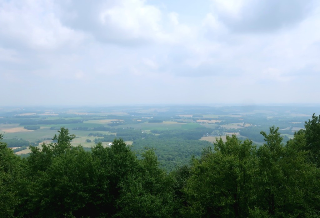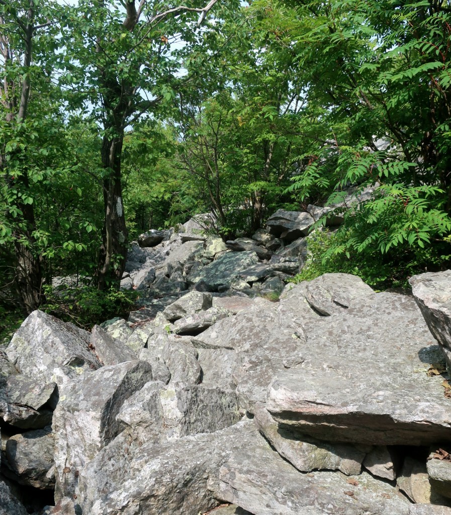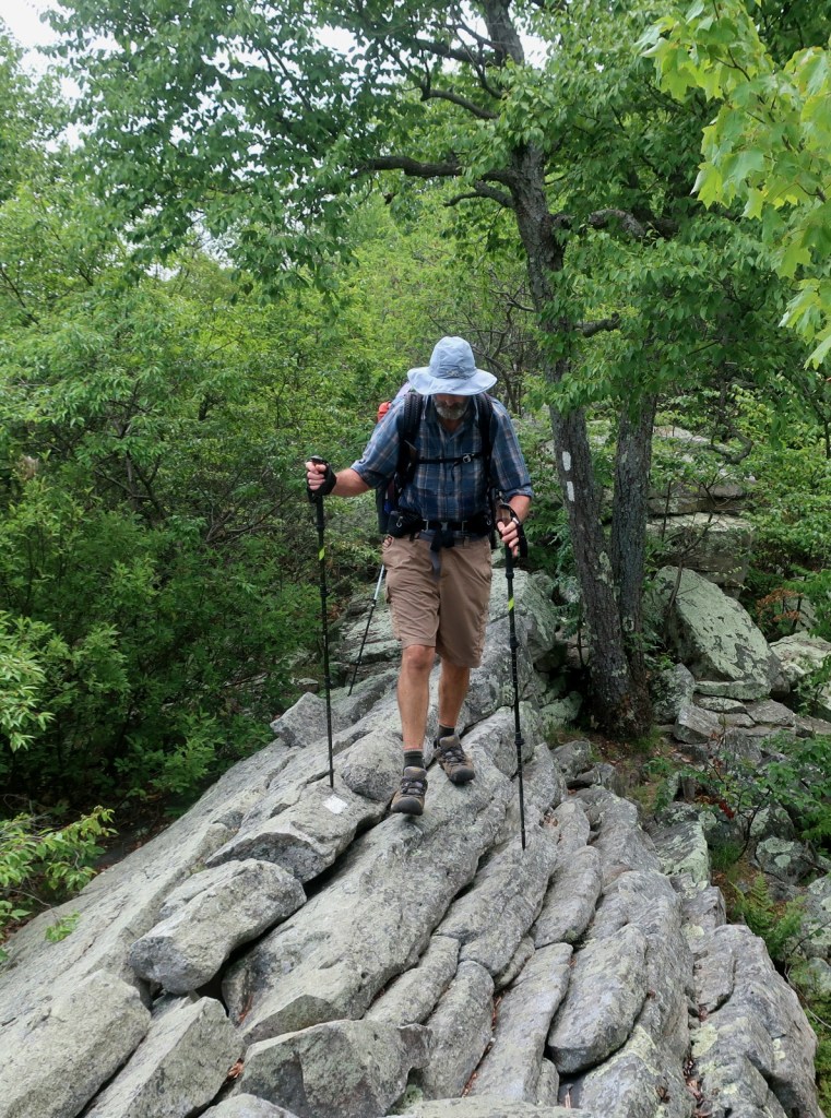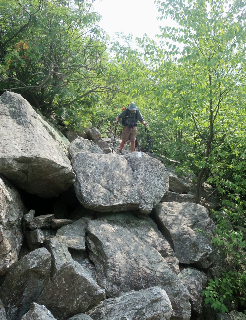 The rocky terrain was not quite over for the day. From the road we ascended towards Bake Oven Knob stepping over more rocky boulders. The view from here was the best we’ve had all day. The ridgeline into New Jersey seemed so much closer now even though the view was smokey. Another person enjoying the view commented that the smokey haze was from the Canadian fires.