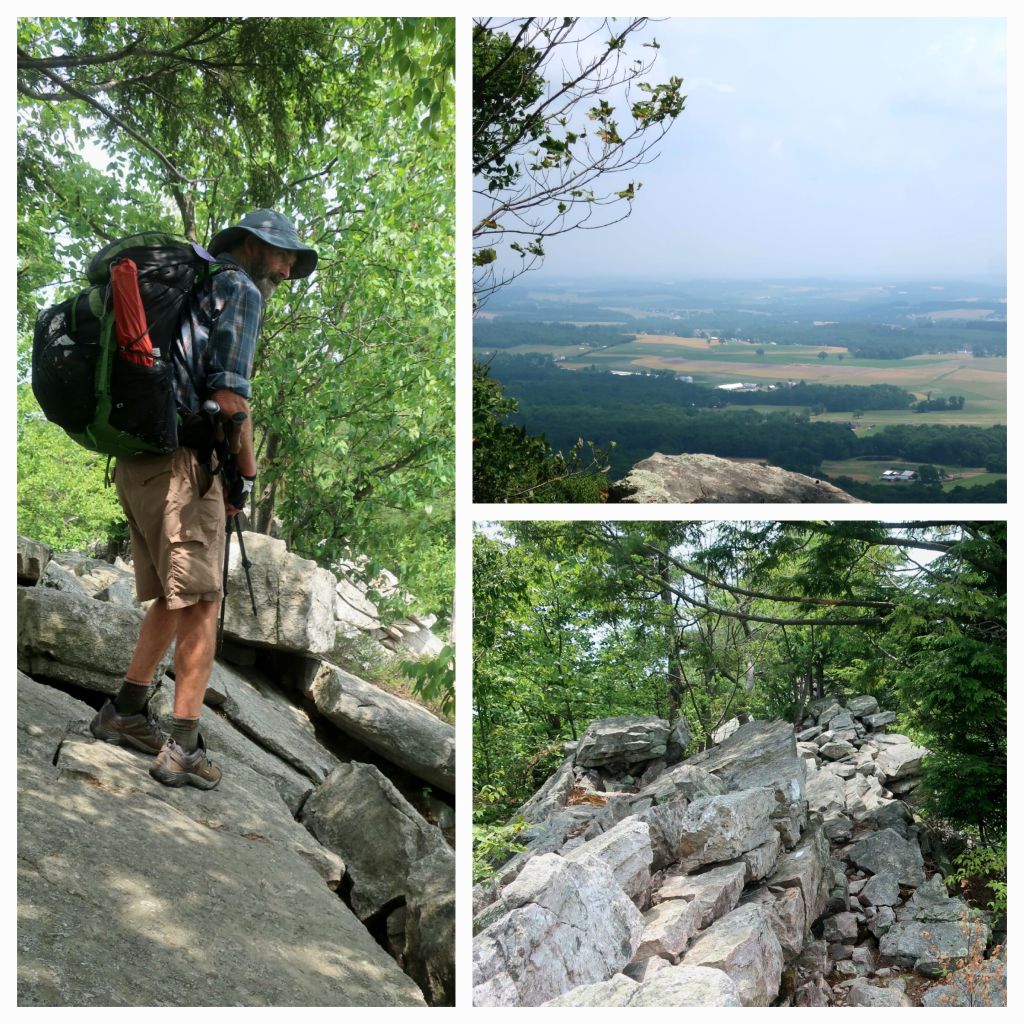 After lunch the sun came out and the trail became a little bit more tricky. Lots of rocks with a very slow traverse of the Knife Edge. When I could take my eyes off the trail the views below were of an agricultural valley which was somewhat obscured by a smoky haze. It was very frustrating as it felt totally unnecessary to wind through this tortuous rocky field. It didn’t help that I banged my head really hard on a low hanging tree branch while trying to focus on foot placement. Hammer was a mountain goat as usual and skipped through here all the while chatting to another hiker who came up behind us. His trail name was ‘Lightweight’ as he has been slackpacking and shuttling on trail since January and sleeping in his van most nights.